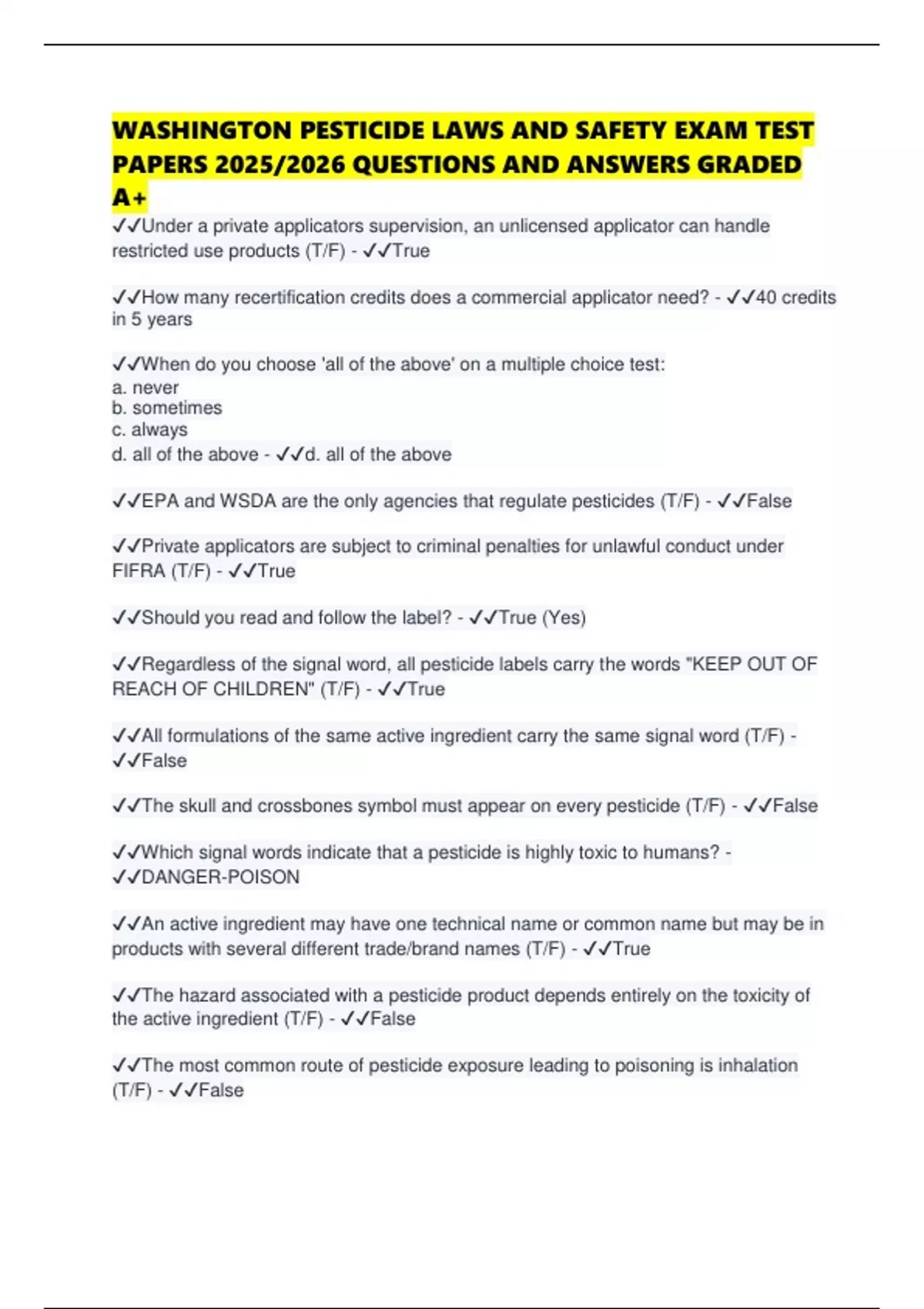 ✔✔EPA and WSDA are the only agencies that regulate pesticides (T/F) - ✔✔False