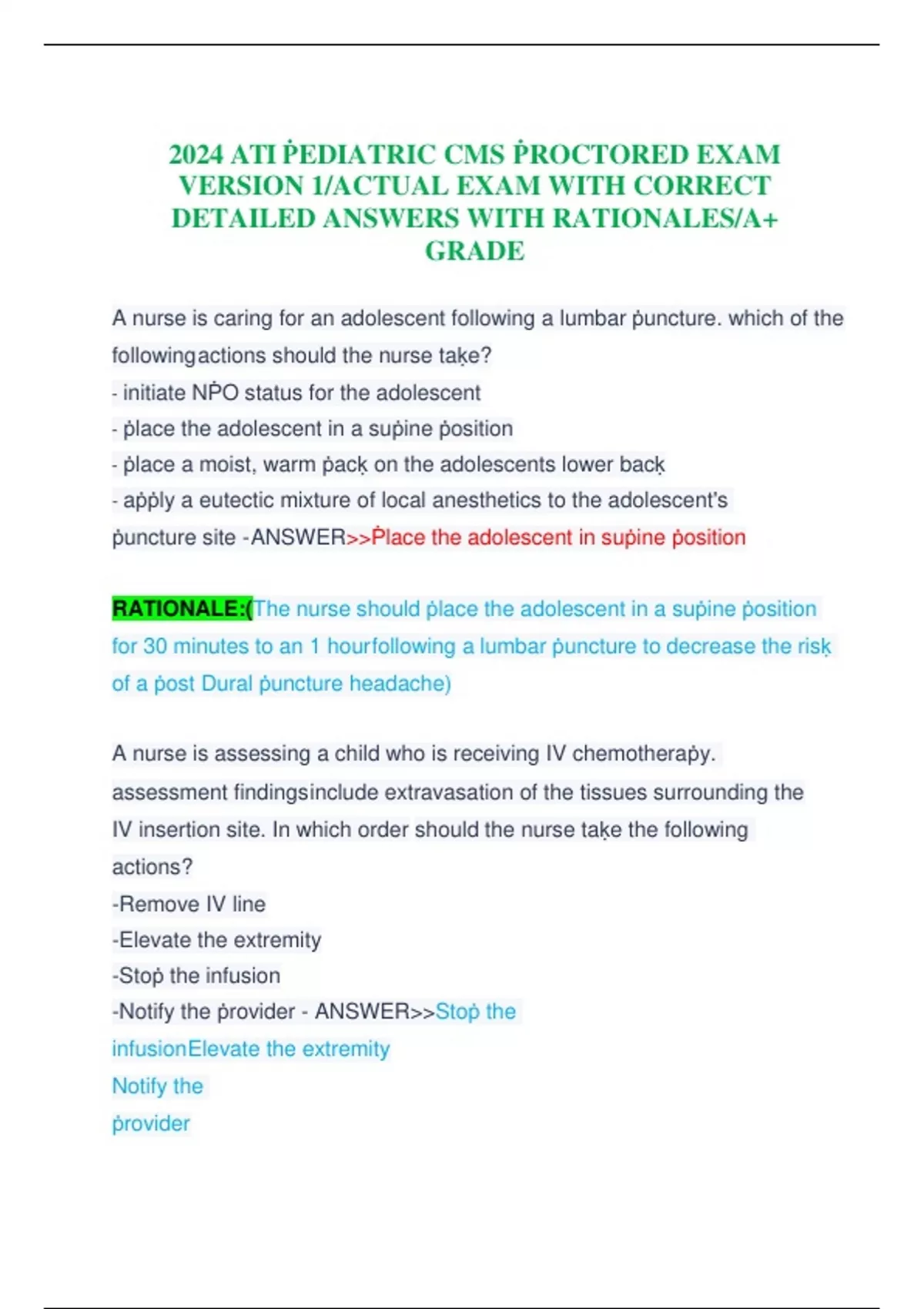 **Ace Your Pediatric Certification Exam with Confidence!** Get instant access to the most comprehensive and up-to-date study resource for the 2025 ATI Pediatric CMS Proctored Exam. This package includes not one, but two complete versions (A & B) of the latest questions and correct, detailed answers, already graded A+ for accuracy and reliability. With this valuable study material, you'll be thoroughly prepared to tackle even the toughest questions on the exam. Our expertly crafted resources ensure that you're equipped with the knowledge and skills necessary to succeed in pediatric care management. **Key Features:** * 2 complete versions (A & B) of the latest 2025 ATI Pediatric CMS Proctored Exam questions * Correct, detailed answers to each question, ensuring accuracy and reliability * Already graded A+, so you can trust the quality of the study material * Comprehensive coverage of pediatric care management topics * Ideal for healthcare professionals seeking certification or recertification **Boost Your Confidence and Pass Your Exam with Ease!** Don't let exam anxiety hold you back. With this comprehensive study package, you'll be well-prepared to achieve success on the 2025 ATI Pediatric CMS Proctored Exam. Order now and take the first step towards advancing your career in pediatric care management!