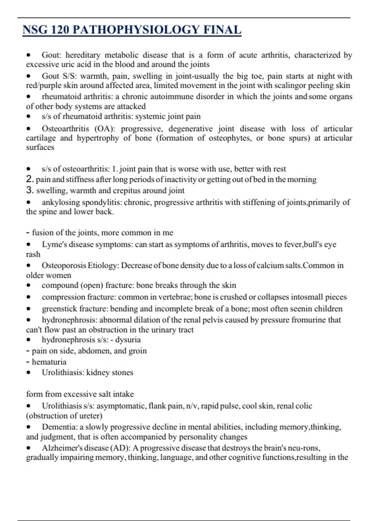 NSG 120 PATHOPHYSIOLOGY FINAL