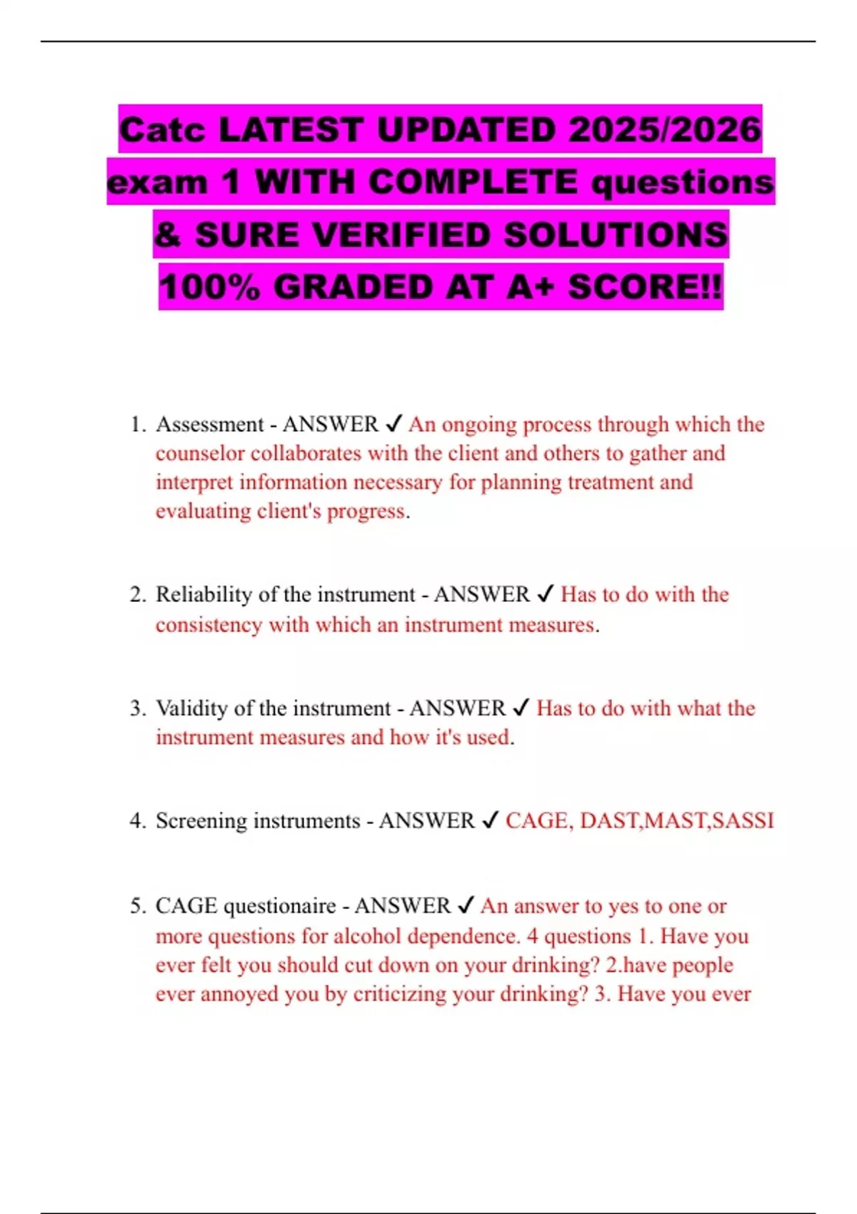 Catc LATEST UPDATED 2025/2026 exam 1 WITH COMPLETE questions & SURE VERIFIED SOLUTIONS 100% GRADED AT A+ SCORE!! 1. Assessment - ANSWER An ongoing process through which the counselor collaborates with the client and others to gather and interpret information necessary for planning treatment and evaluating client's progress. 2. Reliability of the instrument - ANSWER Has to do with the consistency with which an instrument measures. 3. Validity of the instrument - ANSWER Has to do with what the instrument measures and how it's used. 4. Screening instruments - ANSWER CAGE, DAST,MAST,SASSI 5. CAGE questionaire - ANSWER An answer to yes to one or more questions for alcohol dependence. 4 questions 1. Have you ever felt you should cut down on your drinking? people ever annoyed you by criticizing your drinking? 3. Have you ever felt guilty about your drinking? 4. Have you ever had a drink first in the morning to relieve the shakes? 6. DAST(drug abuse screening test) - ANSWER Adopted from MAST. This self report instrument is used to detect abuse or dependence on drugs other than alcohol. It provides a measure of lifetime problem severity. 7. MAST(Michigan screening test) - ANSWER Requires yes/ no questions answers to 25 questions . Scores indicate the absence of alcohol dependence 0-3, possible substance dependence 4, or likely alcohol dependence 5 or higher. 8. SASSI( substance abuse subtle screening inventory) - ANSWER This brief self report is designed to identify clients with high probability of having a substance related disorder. 9. Tools of assessment - ANSWER Counselor's observations, clinical interviews, laboratory test and instruments line tests and self report inventories. 10. Bio psychosocial perspective - ANSWER There's biological, psychological, and social causes of substance abuse 11. Biological factors - ANSWER Includes brain chemistry problems that may be genetic. 12. Genetics - ANSWER Influence biochemistry and biochemistry make some people vulnerable to addiction. 13. Psychological factors - ANSWER Includes cognitive styles, personality traits, and early developmental experiences. 14. Social factors - ANSWER Includes poverty, oppression, poorly developed social skills, and family dysfunction 15. Cultural relevance - ANSWER Take into account client's social context and to not interpret client's behavior as pathological, since it doesn't cause stress to client. 16. Clients are likely to cooperate with assessment - ANSWER If rapport has been established and the reason for assessment procedure is clear 17. Rapport - ANSWER A comfortable working relationship, with the client helps assure the client's trust and cooperation 18. Culturally sensitive language - ANSWER Using "people first" language, communicates respect to clients. Example referring to someone as a person with alcohol dependence rather than an alcoholic. 19. Motivational interviewing - ANSWER Respects the client's perception of the problem . Finding out what stage the client is in . Example pre contemplation, contemplation, action, maintenance. Help client to the next stage 20. Assessment instruments - ANSWER For counselors to aid their identification of, and treatment planning for substance disorders 21. Time line follow back procedure(TLFB) - ANSWER This instrument makes connection between significant events in client's life and alcohol/ drug use patterns and intensity for the past year. It includes a calendar and a standard drink conversion to chart aid memory. It's useful with working with elderly client's especially 22. Diagnostic instruments - ANSWER ADS, DIS-IV, ICS, OCDS, SADD and SDSS 23. Alcohol dependence scale (ADS) - ANSWER This 25 item instrument provides a quantitative measure of the severity of alcohol dependence 24. Diagnostic interview schedule(DIS-IV) alcohol model - ANSWER The 28 questions permit diagnosis of alcohol abuse or dependence 25. Impaired control scale ( ICS) - ANSWER This pencil and paper self administered instrument measures client's attempt to control their drinking during the last 6 months and their perception of their ability to control it now. 26. Addiction severity index (ASI) - ANSWER This is a semi structured interview with 7 sub scales addressing problems in the areas of family/ social status, medical status, employment and support, drug use, alcohol use, legal status, and psychiatric status . It's useful for treatment planning and outcome evaluation with adult client's. 27. Psychological instruments other than substance abuse - ANSWER MMPI-2, the mental status exam, the Myers Briggs type indicator( MBTI 28. The Minnesota multi phasic personality inventory( MMPI-2 - ANSWER Is a personality inventory that contains several clinical scales that detect pathology. 29. The mental status exam - ANSWER Is a series of observations about a client's appearance, behavior, attention, mood,