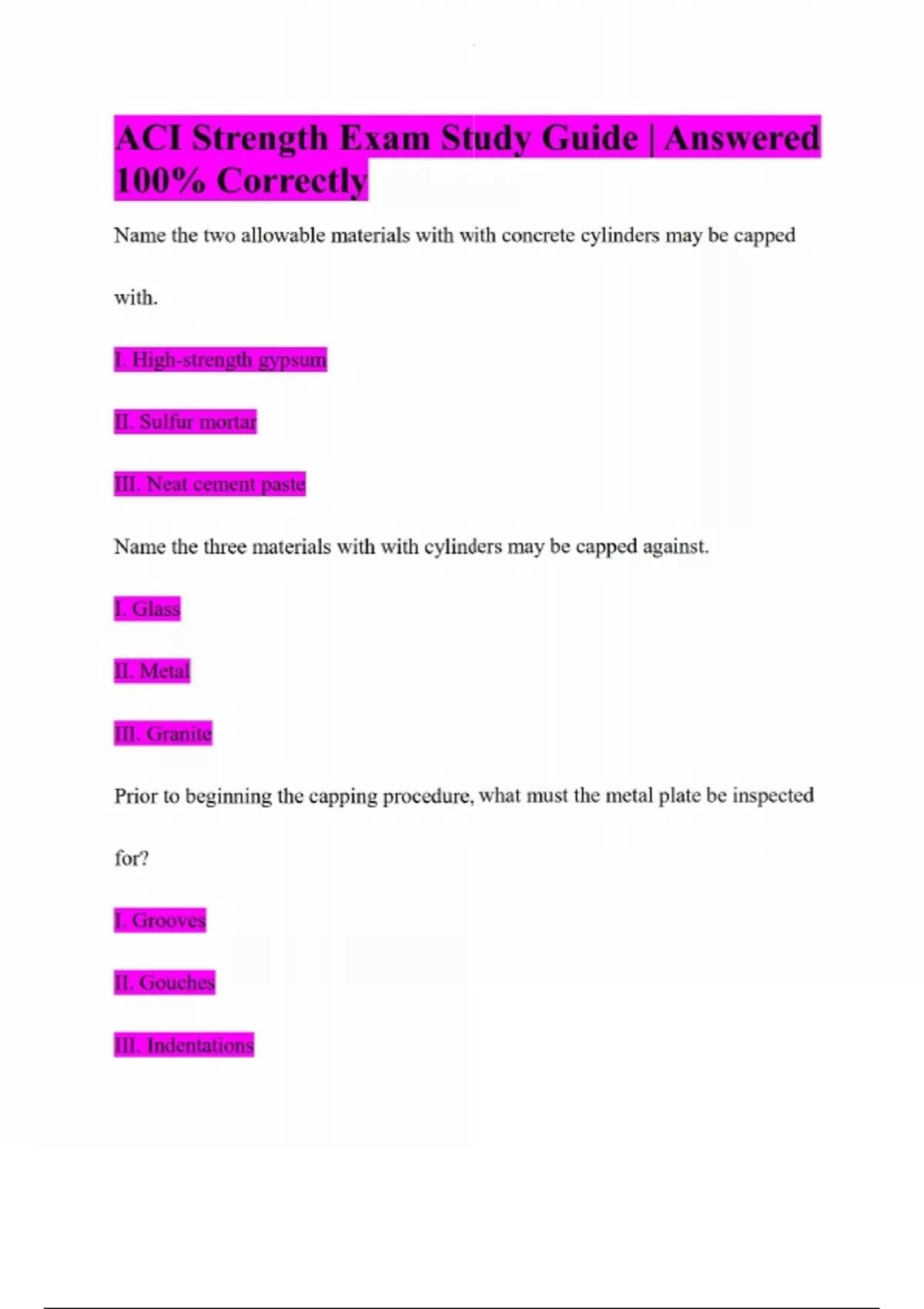 ACI Strength Exam Study Guide | Answered 100% Correctly Name the two allowable materials with with concrete cylinders may be capped with. I. High-strength gypsum II. Sulfur mortar III. Neat cement paste Name the three materials with with cylinders may be capped against. I. Glass II. Metal III. Granite Prior to beginning the capping procedure, what must the metal plate be inspected for? I. Grooves II. Gouches III. IndentationsWhat is the maximum allowable size of any indentation on the base plate? 0.010 in [0.25 mm] Upon receipt of the caping material, for how long can it be kept in intervals? 3 months When must the neat cement paste be applied it to the cylinder? Immediately For how long must the concrete settle in the mold prior to applying the neat cement paste? 2 to 4 hours Prior to capping, name the three tasks that must be performed on the cylinder. I. Inspect for any bumps greater than 1/8" II. Remove foreign debris. III. Remove any excess water or laitence. What is the required position of the concrete cylinder? 90° ± 0.5° Name the required temperature range of the heated sulfar mortar mixture