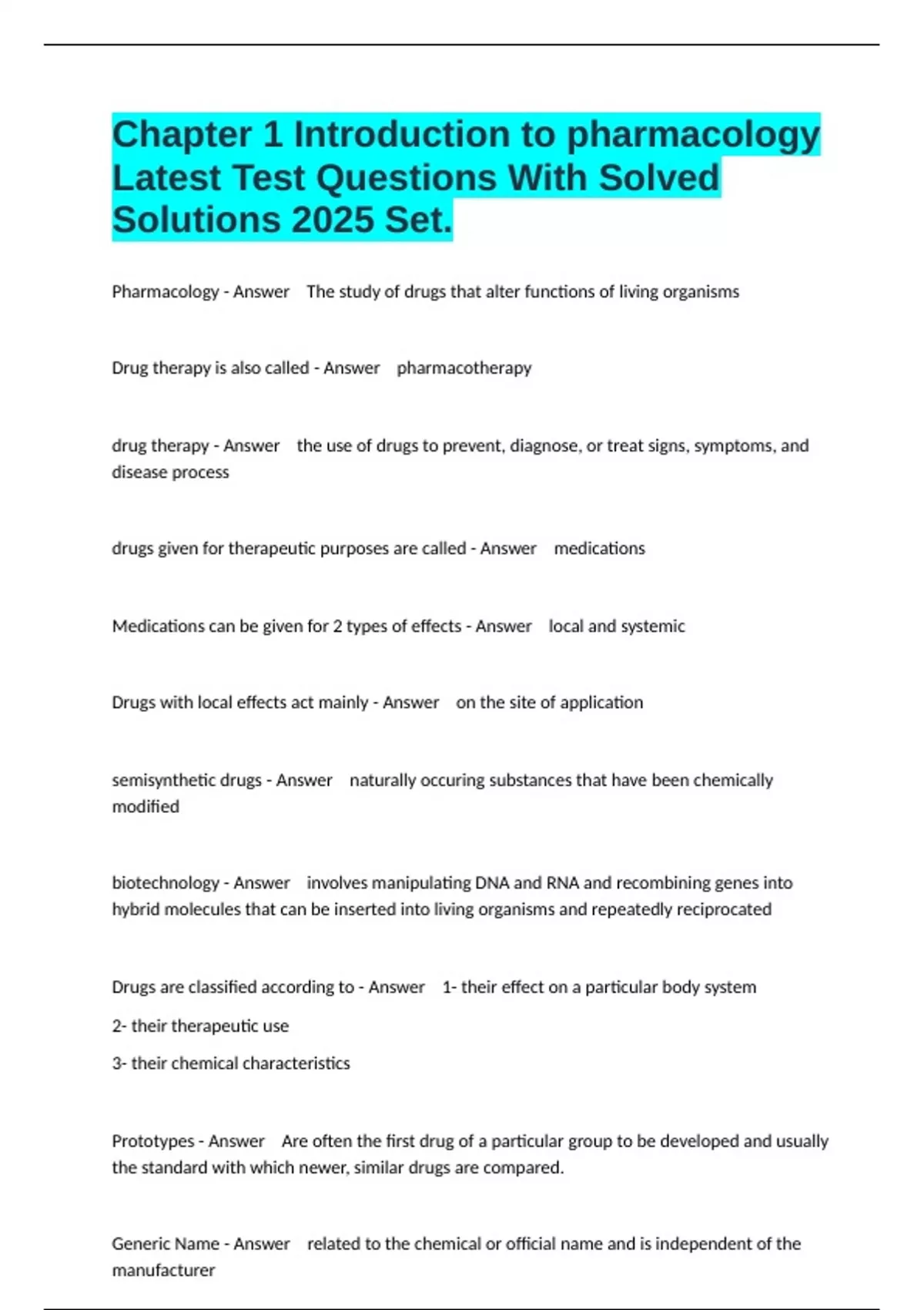 Chapter 1 Introduction to pharmacology Latest Test Questions With Solved Solutions 2025 Set.