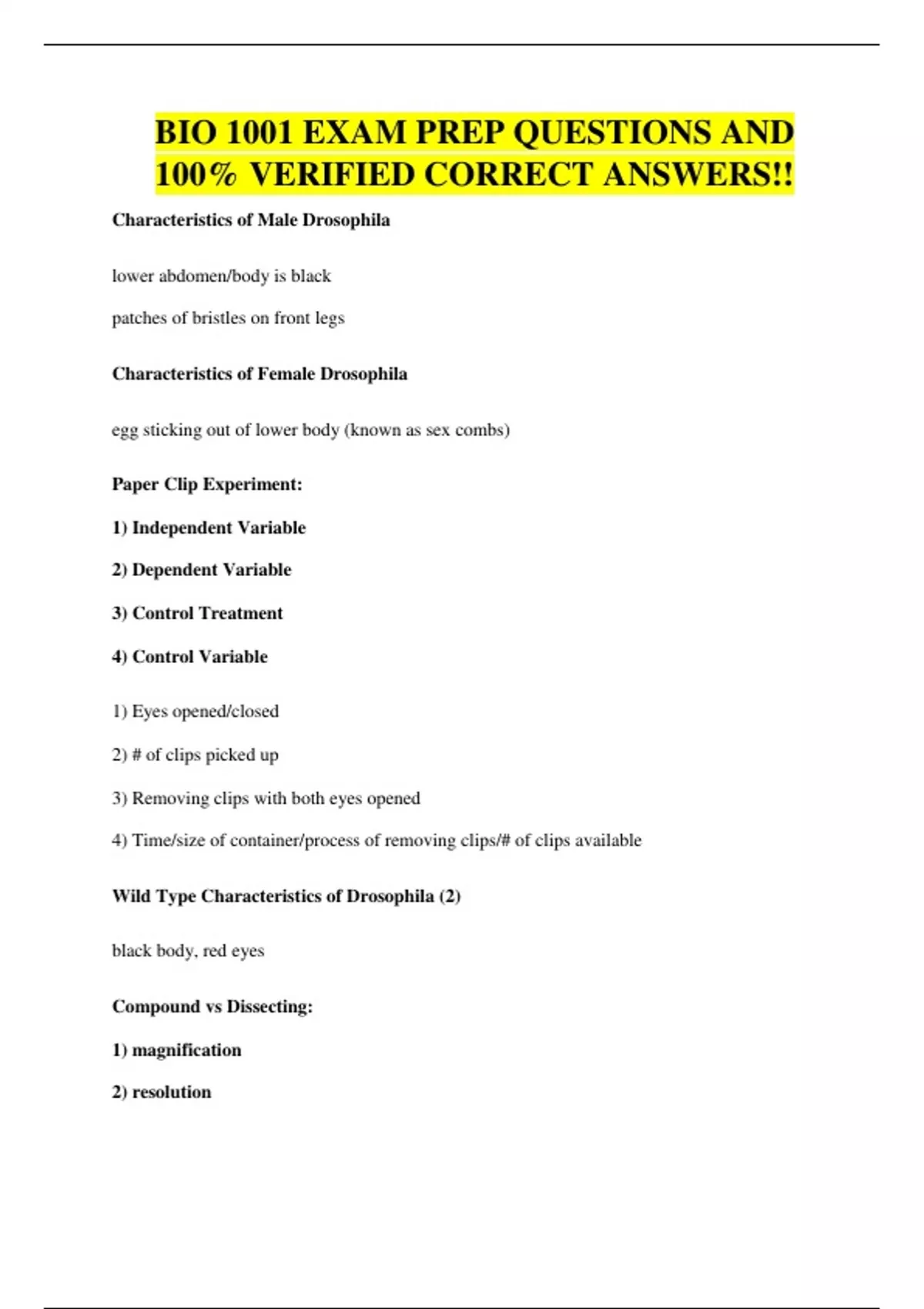 BIO 1001 EXAM PREP QUESTIONS AND 100% VERIFIED CORRECT ANSWERS!!