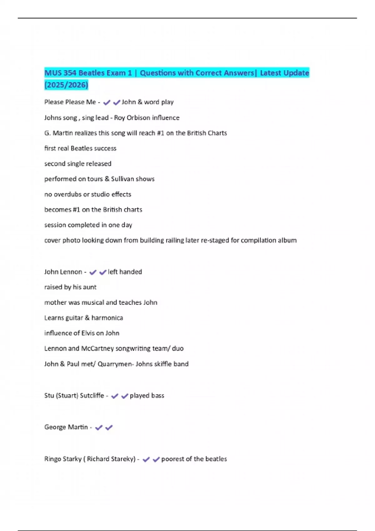 MUS 354 Beatles Exam 1 | Questions with Correct Answers| Latest Update (2025/2026)