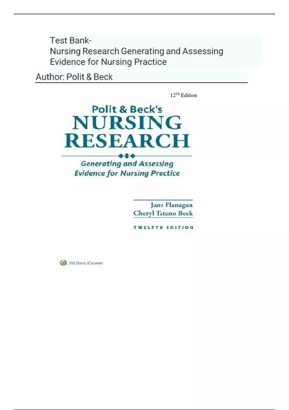 Test Bank- Polit & Beck's Nursing Research Generating and Assessing Evidence for Nursing Practice 12th Edition by Denise Polit. All Chapters . Latest 2025