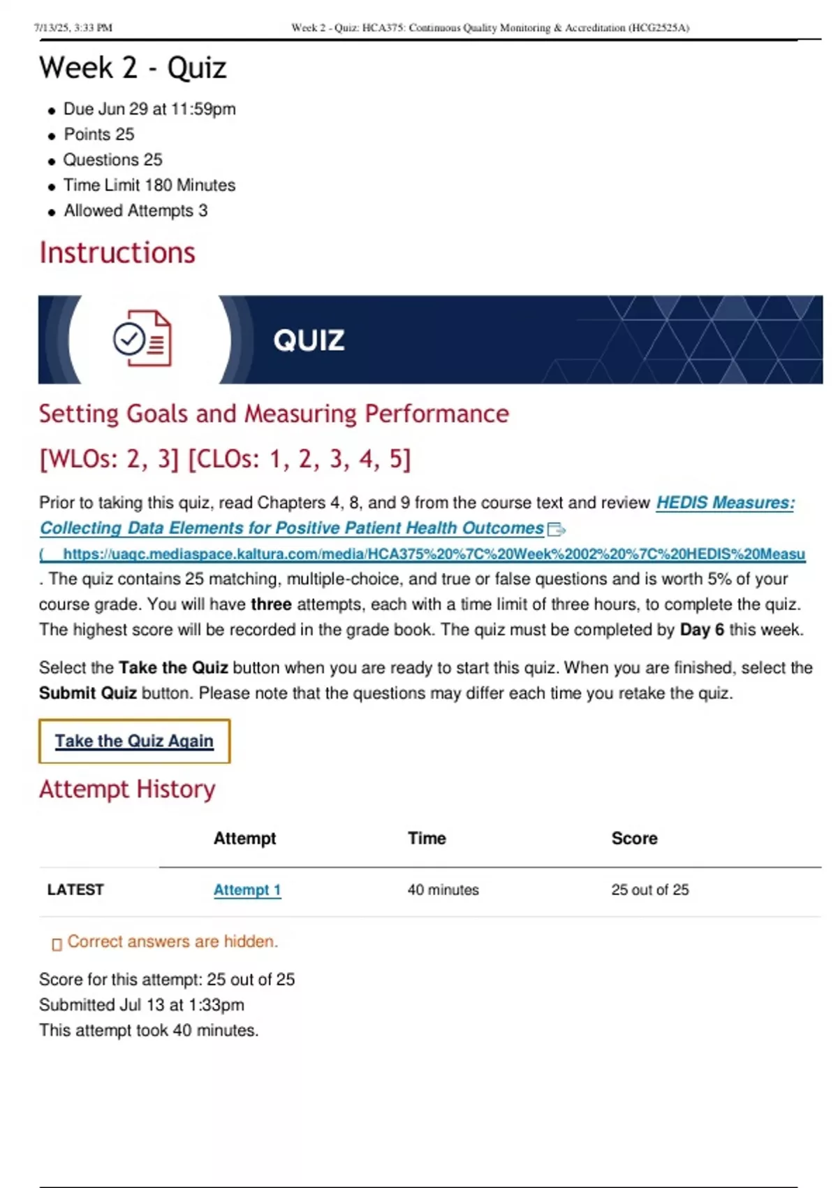 HCA 375 Week 2 Quiz | Score 25/25 | Ashford University