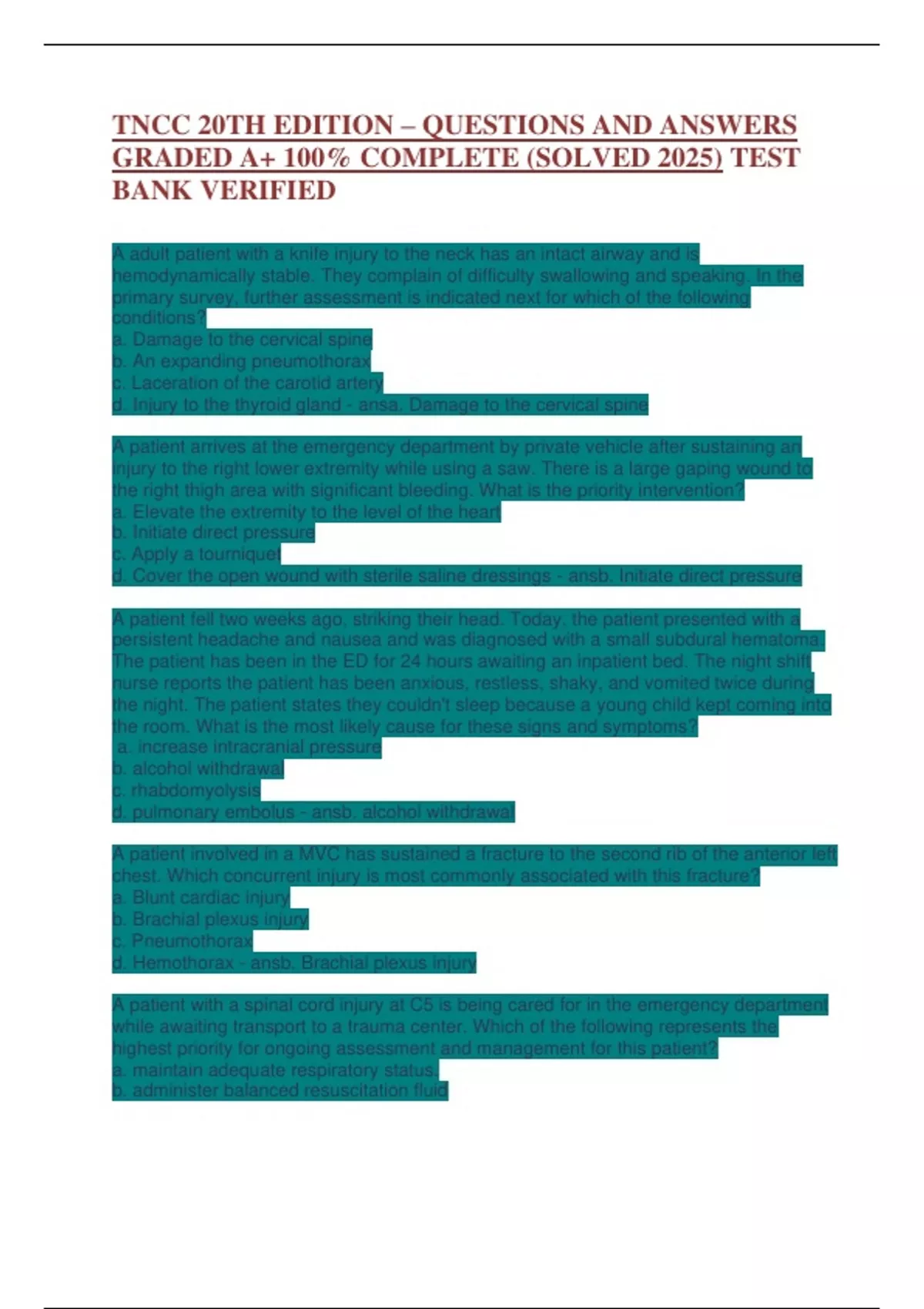 ,TNCC 20TH EDITION – QUESTIONS AND ANSWERS