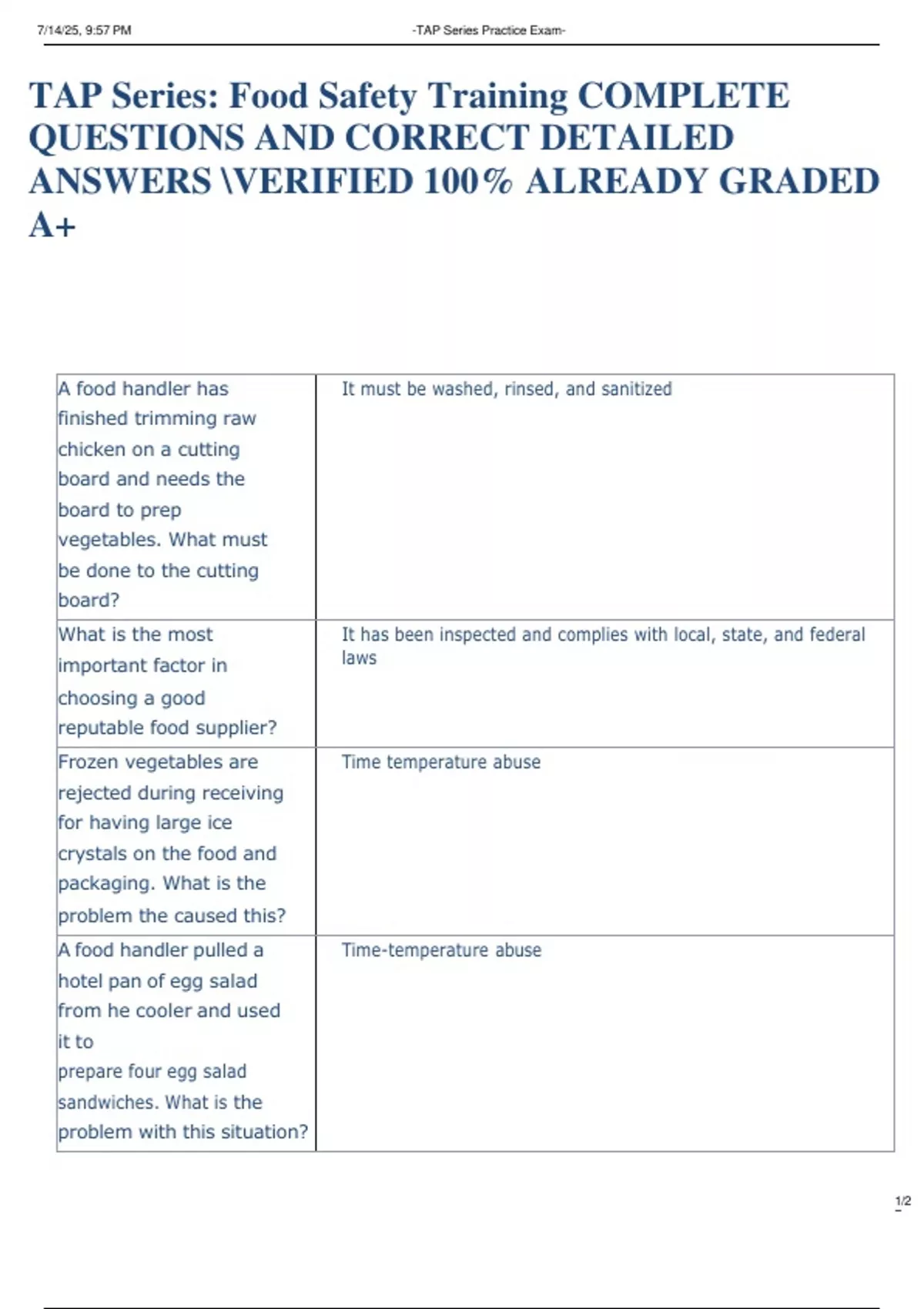 TAP Series: Food Safety Training COMPLETE QUESTIONS AND CORRECT DETAILED ANSWERS VERIFIED 100% ALREADY GRADED A+ TAP Series: Food Safety Training COMPLETE QUESTIONS AND CORRECT DETAILED ANSWERS VERIFIED 100% ALREADY GRADED A+ TAP Series: Food Safety Training COMPLETE QUESTIONS AND CORRECT DETAILED ANSWERS VERIFIED 100% ALREADY GRADED A+ TAP Series: Food Safety Training COMPLETE QUESTIONS AND CORRECT DETAILED ANSWERS VERIFIED 100% ALREADY GRADED A+ TAP Series: Food Safety Training COMPLETE QUESTIONS AND CORRECT DETAILED ANSWERS VERIFIED 100% ALREADY GRADED A+ TAP Series: Food Safety Training COMPLETE QUESTIONS AND CORRECT DETAILED ANSWERS VERIFIED 100% ALREADY GRADED A+ TAP Series: Food Safety Training COMPLETE QUESTIONS AND CORRECT DETAILED ANSWERS VERIFIED 100% ALREADY GRADED A+ TAP Series: Food Safety Training COMPLETE QUESTIONS AND CORRECT DETAILED ANSWERS VERIFIED 100% ALREADY GRADED A+ TAP Series: Food Safety Training COMPLETE QUESTIONS AND CORRECT DETAILED ANSWERS VERIFIED 100% ALREADY GRADED A+ TAP Series: Food Safety Training COMPLETE QUESTIONS AND CORRECT DETAILED ANSWERS VERIFIED 100% ALREADY GRADED A+ TAP Series: Food Safety Training COMPLETE QUESTIONS AND CORRECT DETAILED ANSWERS VERIFIED 100% ALREADY GRADED A+ TAP Series: Food Safety Training COMPLETE QUESTIONS AND CORRECT DETAILED ANSWERS VERIFIED 100% ALREADY GRADED A+ TAP Series: Food Safety Training COMPLETE QUESTIONS AND CORRECT DETAILED ANSWERS VERIFIED 100% ALREADY GRADED A+ TAP Series: Food Safety Training COMPLETE QUESTIONS AND CORRECT DETAILED ANSWERS VERIFIED 100% ALREADY GRADED A+ TAP Series: Food Safety Training COMPLETE QUESTIONS AND CORRECT DETAILED ANSWERS VERIFIED 100% ALREADY GRADED A+