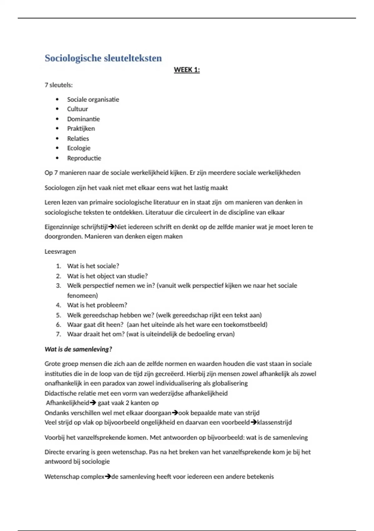 Het document bevat aantekeningen over belangrijke thema’s en denkers binnen de sociologie. Het is opgebouwd rond de zeven sleutels waarmee naar de sociale werkelijkheid gekeken wordt: sociale organisatie, cultuur, dominantie, praktijken, relaties, ecologie en reproductie. Per sleutel worden theorieën en kernbegrippen behandeld, vaak aan de hand van klassieke en moderne sociologen. Het document bevat uitleg over sociologische basisbegrippen, zoals sociale feiten, cultuur als betekenissysteem, sociale netwerken, machtsstructuren, handelen en de rol van instituties. Ook komen meer actuele benaderingen aan bod. De inhoud is grotendeels gebaseerd op colleges, close readings en oefeningen, met veel voorbeelden, toelichtingen en verwijzingen naar sociologische literatuur.