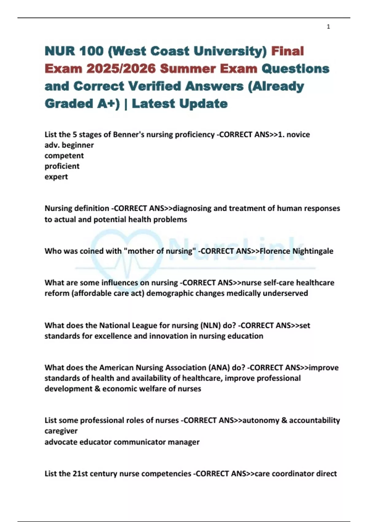 NUR 100 (West Coast University) Final Exam 2025/2026 Summer Exam Questions and Correct Verified Answers (Already Graded A+) | Latest Update List the 5 stages of Benner's nursing proficiency -CORRECT ANS>>1. novice adv. beginner competent proficient expert Nursing definition -CORRECT ANS>>diagnosing and treatment of human responses to actual and potential health problems Who was coined with "mother of nursing" -CORRECT ANS>>Florence Nightingale What are some influences on nursing -CORRECT ANS>>nurse self-care healthcare reform (affordable care act) demographic changes medically underserved What does the National League for nursing (NLN) do? -CORRECT ANS>>set standards for excellence and innovation in nursing education What does the American Nursing Association (ANA) do? -CORRECT ANS>>improve standards of health and availability of healthcare, improve professional development & economic welfare of nurses List some professional roles of nurses -CORRECT ANS>>autonomy & accountability caregiver advocate educator communicator manager List the 21st century nurse competencies -CORRECT ANS>>care coordinator direct 2 care of complex patients outcome evaluation What is the purpose of nursing theory? -CORRECT ANS>>provide nurses w/ perspective to view client situations, way to organize data, method to analyze and interpret information What are the 4 domains of nursing? -CORRECT ANS>>1. person health environment/situation nursing What is the nursing process acronym? -CORRECT ANS>>ADPIE Assessment Diagnosis Planning Implementation Evaluation What is the foundation of nursing clinical decision making? -CORRECT ANS>>Nursing Process (ADPIE) This nursing theorist was focused on environment -CORRECT ANS>>Florence Nightingale This nursing theorist was focused on self-care -CORRECT ANS>>Dorothy Orem This nursing theorist was focused on systems & the whole person -CORRECT ANS>>Betty Neuman This nursing theorist was focused on science of caring, health promotions, and restore patient to health -CORRECT ANS>>Jean Watson Who coined the theory of caring and what did it promote? -CORRECT ANS>>Jean Watson promotes healing & wholeness 3 rejects the disease orientation to healthcare care before cure nurse/ pt ratio Give examples of providing presence -CORRECT ANS>>- being with eye contact listening body language tone of voice positive & encourage attitude Steps of Evidence -based practice (EBP) -CORRECT ANS>>0. Consistently questioning Ask the clinical question. Collect the best evidence. Critique the evidence. Integrate the evidence. Evaluate the practice decision or change. Share the outcomes of EBP changes with others. PICOT format -CORRECT ANS>>*P* - Identify the population or problem (age, gender, ethnicity, disease/disorder) *I* - Intervention, or range of interventions of interest (exposure to disease, risk behavior, education) *C* - What will you compare the intervention against? (no disease, absence of risk factors, placebo or no intervention) *O* - Outcome of interest (risk of disease, rates of occurrence of adverse outcomes, accuracy of diagnosis) *T* - Time it takes for intervention to achieve the outcome (selected to observe the population or problem/condition) What does the Nurse Practice Act do? -CORRECT ANS>>regulates the scope of nursing practice & protects public health, safety, and welfare. What type of law is Nurse Practice Act -CORRECT ANS>>civil 4 Accountability definition -CORRECT ANS>>must answer for all activities surrounding client care; legally and professionally Responsibility definition -CORRECT ANS>>nurse is conscientious and honest in all professional activities What is the entry level proficiency exam for nurses? -CORRECT ANS>>NCLEX What law limits liability for rendering emergency assistance outside of employment setting? -CORRECT ANS>>Good Samaritan Law Who defines practice of LPN and RN and is established by Michigan State Board of Nursing? -CORRECT ANS>>Public Health Code What is the State Board of Nursing responsible for? -CORRECT ANS>>*appointed members by governor* determine scope of practice set min education standards licensure/renewal disciplinary actions establish requirements to obtain a nursing license Americans with dis -CORRECT ANS>>Comprehensive legislation that is designed to protect individuals with disabilities (mental/physical) against discrimination.