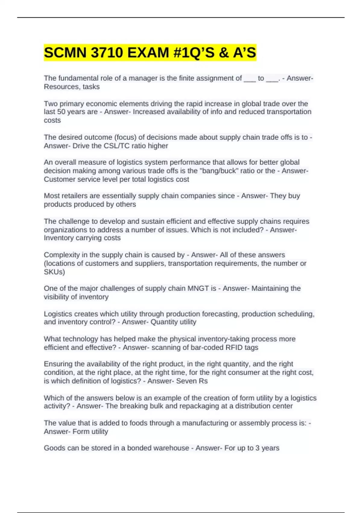 SCMN 3710 EXAM #1Q’S & A’S The fundamental role of a manager is the finite assignment of ___ to ___. - Answer- Resources, tasks Two primary economic elements driving the rapid increase in global trade over the last 50 years are - Answer- Increased availability of info and reduced transportation costs The desired outcome (focus) of decisions made about supply chain trade offs is to - Answer- Drive the CSL/TC ratio higher An overall measure of logistics system performance that allows for better global decision making among various trade offs is the "bang/buck" ratio or the - Answer- Customer service level per total logistics cost Most retailers are essentially supply chain companies since - Answer- They buy products produced by others The challenge to develop and sustain efficient and effective supply chains requires organizations to address a number of issues. Which is not included? - Answer- Inventory carrying costs Complexity in the supply chain is caused by - Answer- All of these answers (locations of customers and suppliers, transportation requirements, the number or SKUs) One of the major challenges of supply chain MNGT is - Answer- Maintaining the visibility of inventory Logistics creates which utility through production forecasting, production scheduling, and inventory control? - Answer- Quantity utility What technology has helped make the physical inventory-taking process more efficient and effective? - Answer- scanning of bar-coded RFID tags Ensuring the availability of the right product, in the right quantity, and the right condition, at the right place, at the right time, for the right consumer at the right cost, is which definition of logistics? - Answer- Seven Rs Which of the answers below is an example of the creation of form utility by a logistics activity? - Answer- The breaking bulk and repackaging at a distribution center The value that is added to foods through a manufacturing or assembly process is: - Answer- Form utility Goods can be stored in a bonded warehouse - Answer- For up to 3 years Focused production is - Answer- A strategy in which a given plant produces one or two items of the company's total product line