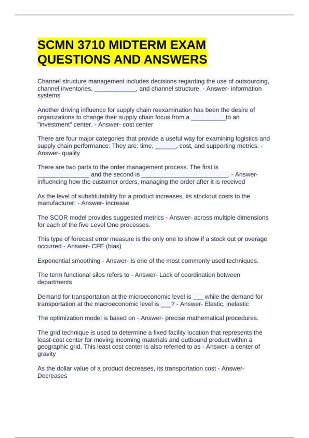 SCMN 3710 MIDTERM EXAM QUESTIONS AND ANSWERS Channel structure management includes decisions regarding the use of outsourcing, channel inventories, ____________, and channel structure. - Answer- information systems Another driving influence for supply chain reexamination has been the desire of organizations to change their supply chain focus from a __________to an "investment" center. - Answer- cost center There are four major categories that provide a useful way for examining logistics and supply chain performance: They are: time, ______, cost, and supporting metrics. - Answer- quality There are two parts to the order management process. The first is _______________ and the second is _________________________. - Answer- influencing how the customer orders, managing the order after it is received As the level of substitutability for a product increases, its stockout costs to the manufacturer: - Answer- increase The SCOR model provides suggested metrics - Answer- across multiple dimensions for each of the five Level One processes. This type of forecast error measure is the only one to show if a stock out or overage occurred - Answer- CFE (bias) Exponential smoothing - Answer- Is one of the most commonly used techniques. The term functional silos refers to - Answer- Lack of coordination between departments Demand for transportation at the microeconomic level is ___ while the demand for transportation at the macroeconomic level is ___? - Answer- Elastic, inelastic The optimization model is based on - Answer- precise mathematical procedures. The grid technique is used to determine a fixed facility location that represents the least-cost center for moving incoming materials and outbound product within a geographic grid. This least cost center is also referred to as - Answer- a center of gravity As the dollar value of a product decreases, its transportation cost - Answer- Decreases The value that is added to goods through a manufacturing or ass