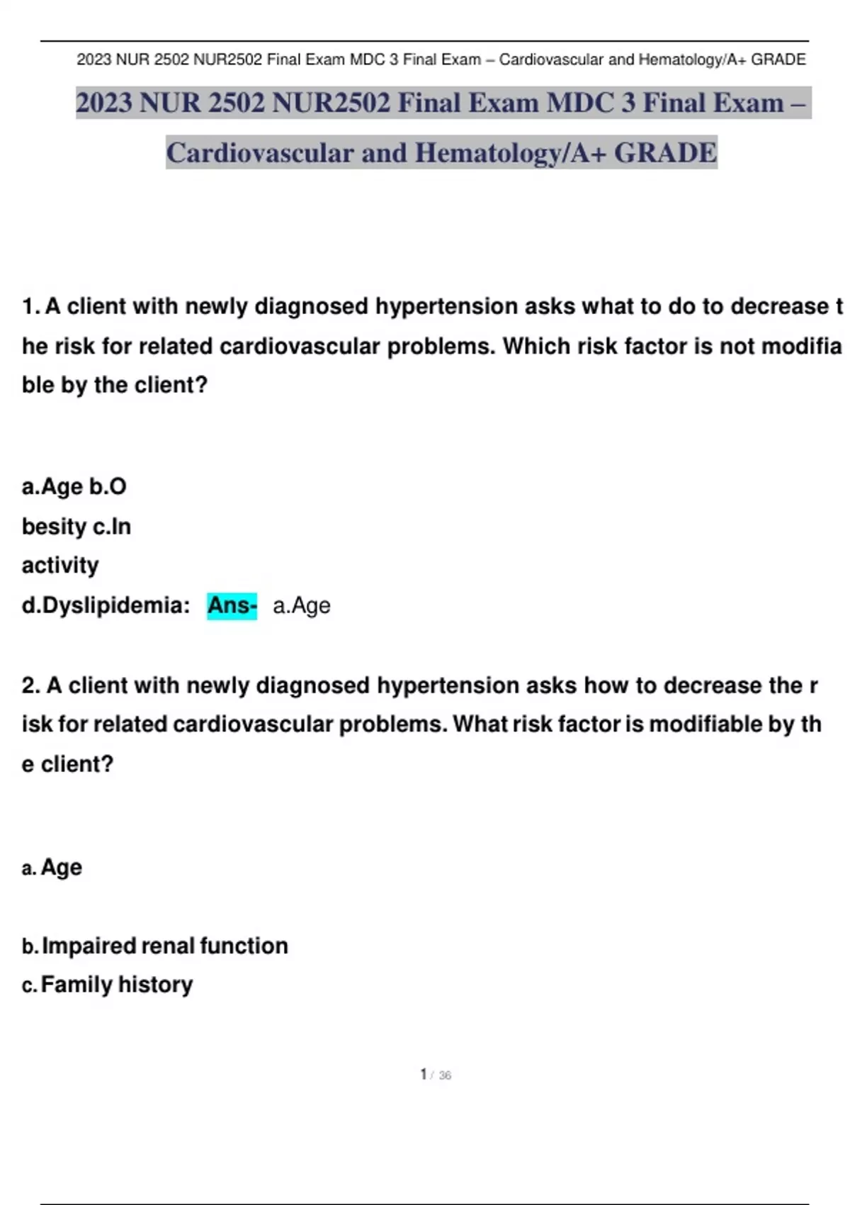 , 2023iiNURii2502iiNUR2502iiFinaliiExamiiMDCii3iiFinaliiExamii–iiCardiovasculariiandiiHematology/A+iiGRADE