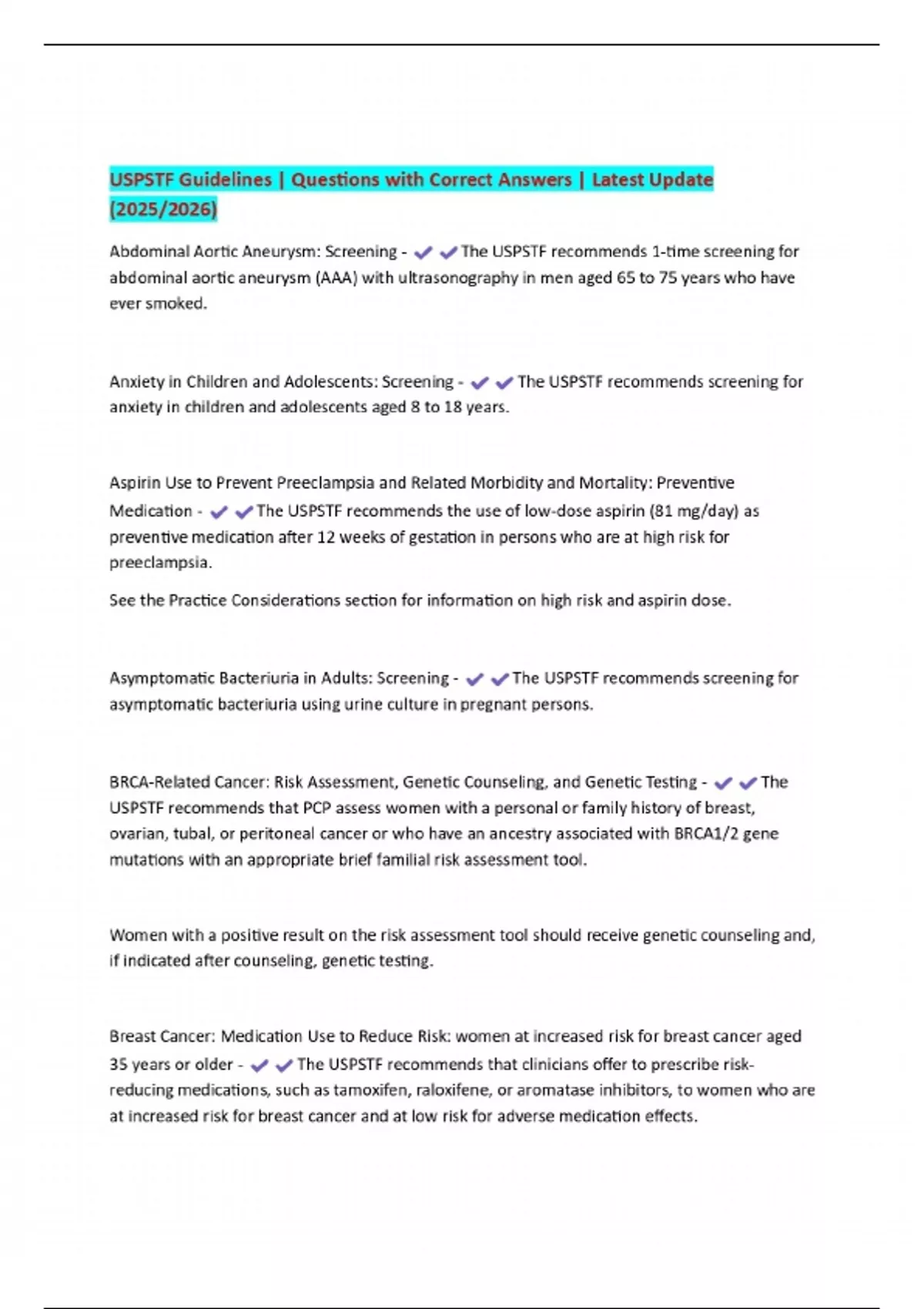 USPSTF Guidelines | Questions with Correct Answers | Latest Update (2025/2026)