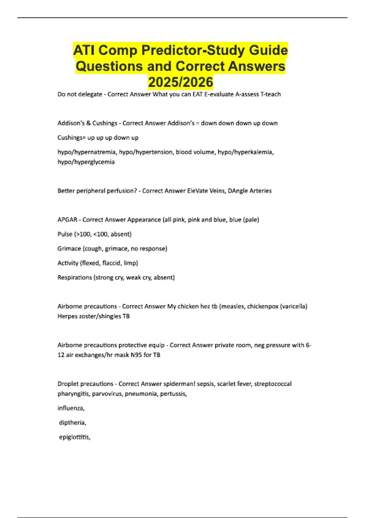 ATI Comp Predictor-Study Guide Questions and Correct Answers 2025/2026 Do not delegate - Correct Answer What you can EAT E-evaluate A-assess T-teach Addison's & Cushings - Correct Answer Addison's = down down down up down Cushings= up up up down up hypo/hypernatremia, hypo/hypertension, blood volume, hypo/hyperkalemia, hypo/hyperglycemia Better peripheral perfusion? - Correct Answer EleVate Veins, DAngle Arteries APGAR - Correct Answer Appearance (all pink, pink and blue, blue (pale) Pulse (>100, <100, absent) Grimace (cough, grimace, no response) Activity (flexed, flaccid, limp) Respirations (strong cry, weak cry, absent) Airborne precautions - Correct Answer My chicken hez tb (measles, chickenpox (varicella) Herpes zoster/shingles TB Airborne precautions protective equip - Correct Answer private room, neg pressure with 6-12 air exchanges/hr mask N95 for TB Droplet precautions - Correct Answer spiderman! sepsis, scarlet fever, streptococcal