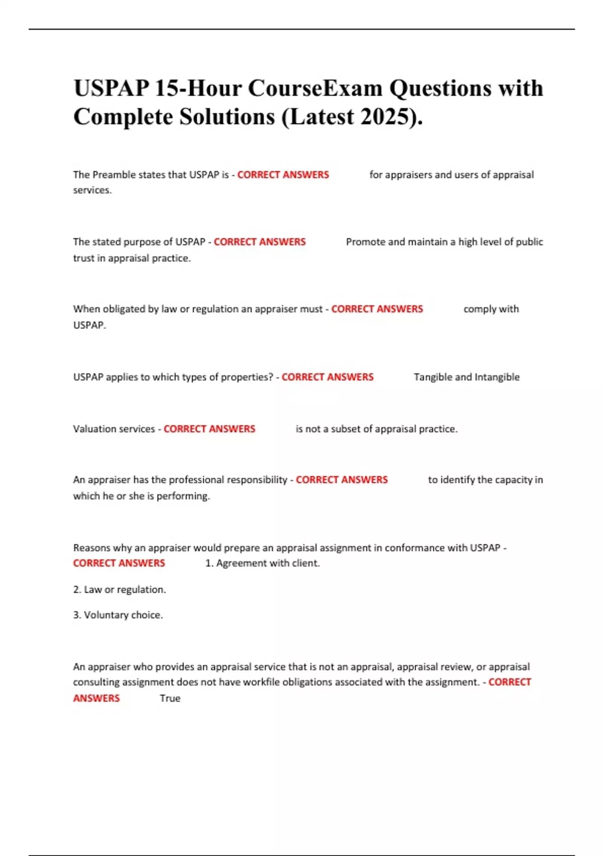 USPAP 15-Hour CourseExam Questions with Complete Solutions (Latest 2025).