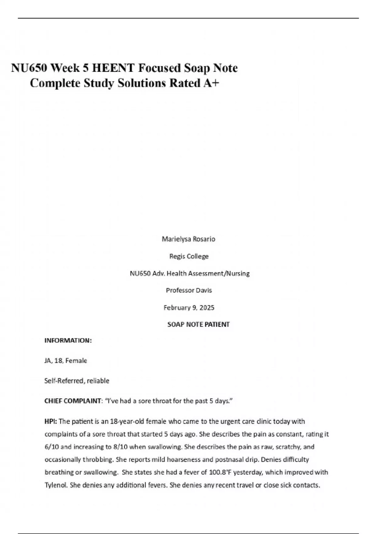 NU650 Week 5 HEENT Focused Soap Note Complete Study Solutions Rated A+
