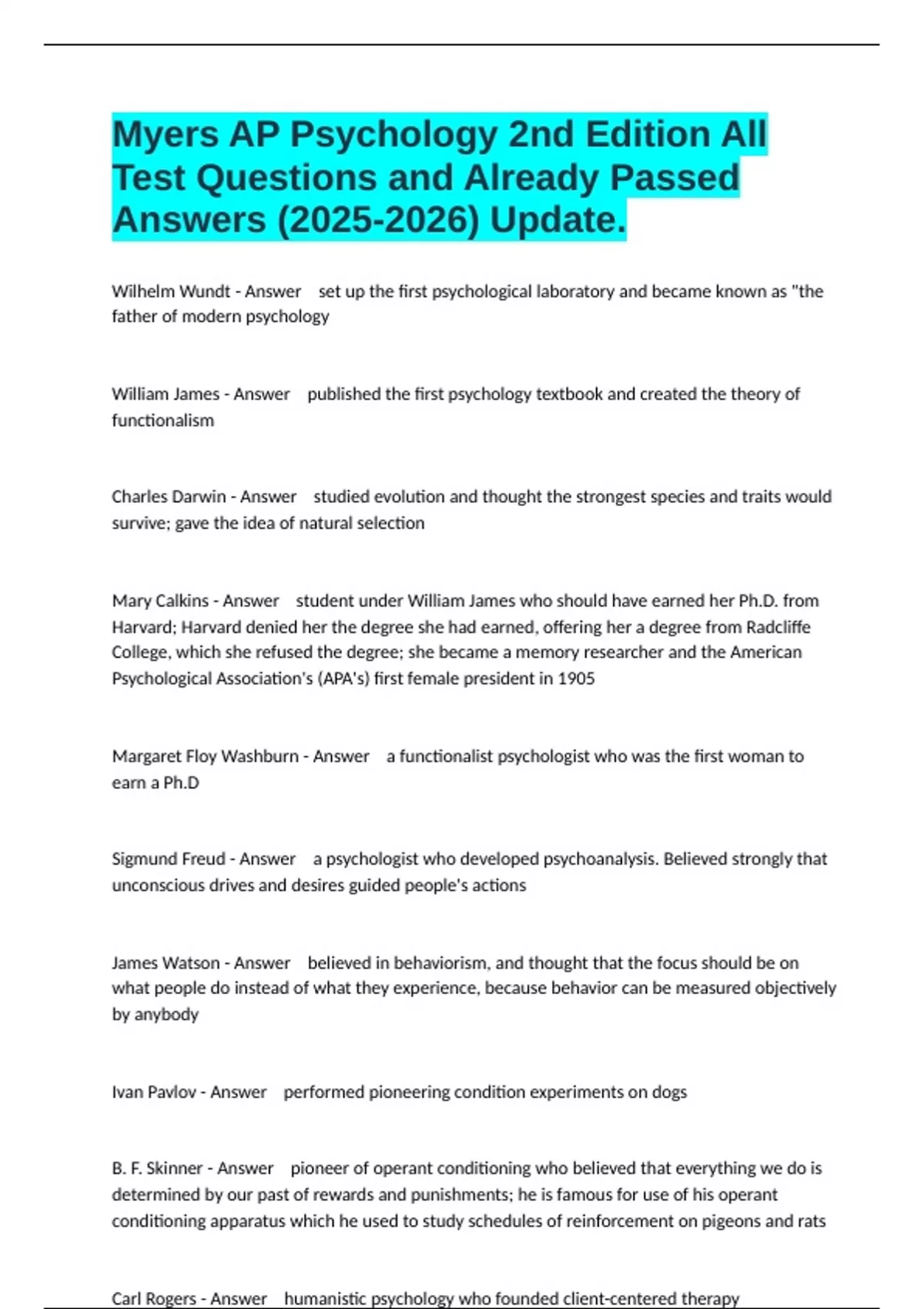 Wilhelm Wundt - Answer set up the first psychological laboratory and became known as "the