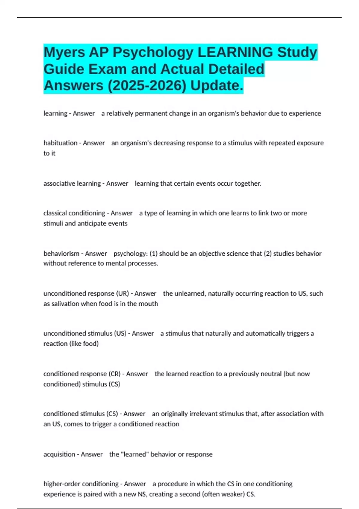 Myers AP Psychology LEARNING Study Guide Exam and Actual Detailed Answers () Update.