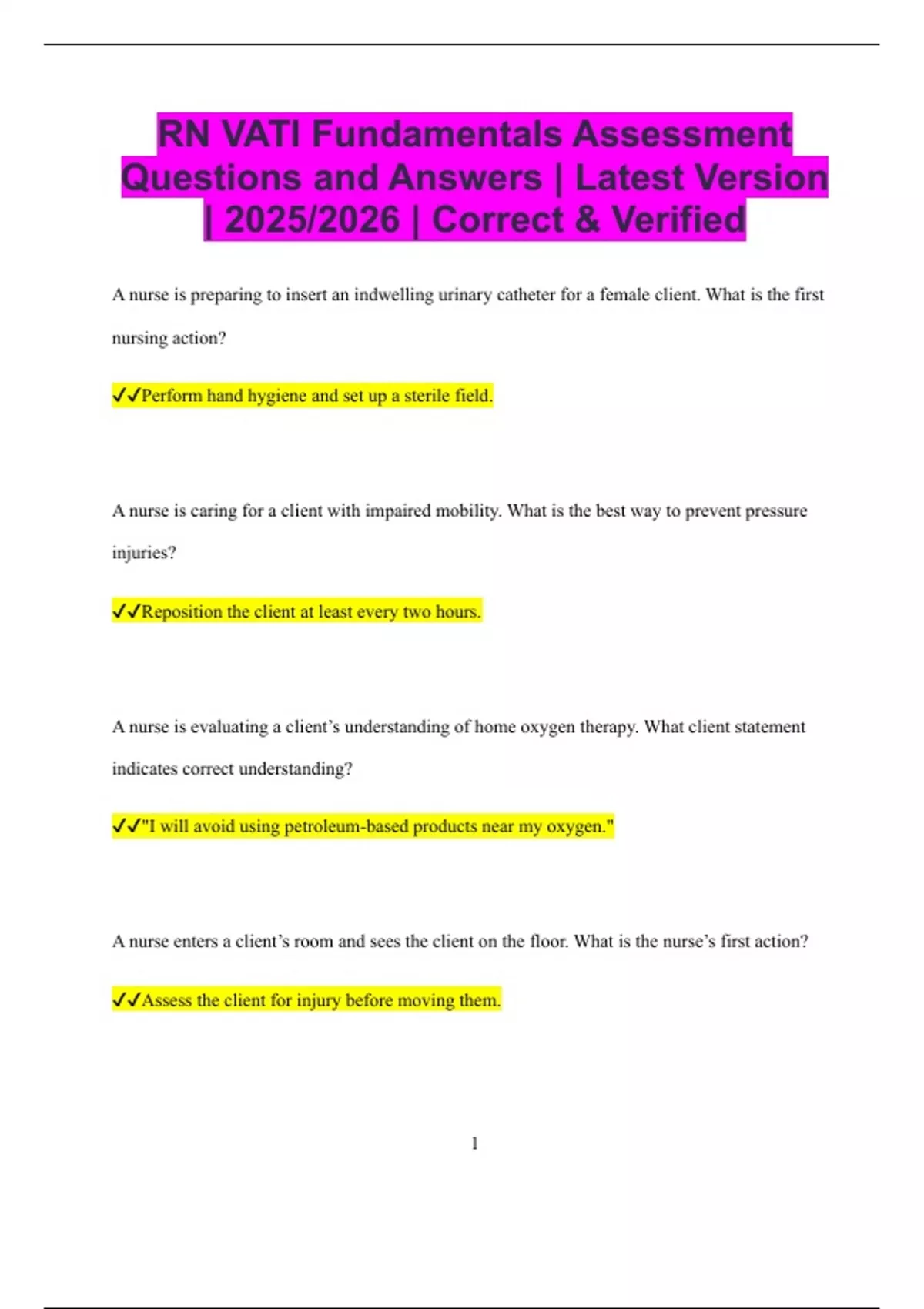 RN VATI Fundamentals Assessment Questions and Answers | Latest Version | 2025/2026 | Correct & Verified A nurse is preparing to insert an indwelling urinary catheter for a female client. What is the first nursing action? Perform hand hygiene and set up a sterile field. A nurse is caring for a client with impaired mobility. What is the best way to prevent pressure injuries? Reposition the client at least every two hours. A nurse is evaluating a client’s understanding of home oxygen therapy. What client statement indicates correct understanding? "I will avoid using petroleum-based products near my oxygen." A nurse enters a client’s room and sees the client on the floor. What is the nurse’s first action? Assess the client for injury before moving them. 2 A nurse is teaching a client how to use a walker. What is the correct instruction? Move the walker forward, then step with the affected leg. A nurse is reinforcing teaching about hand hygiene. When should the nurse use soap and water instead of alcohol-based sanitizer? When hands are visibly soiled or after contact with bodily fluids. A nurse is changing a surgical dressing and notes thick yellow drainage. What should the nurse do next? Notify the provider of signs of possible infection. A nurse is preparing to ambulate a postoperative client. What is the priority assessment? Check the client’s blood pressure and level of alertness. A nurse is caring for a client who is NPO and scheduled for a procedure. The client requests water. What is the appropriate response? Explain the reason for the restriction and provide mouth care instead. 3 A client tells the nurse, “I’m scared about my surgery tomorrow.” What is the best response? "Tell me more about what is making you feel scared." A nurse is caring for a client receiving enteral tube feeding. What action helps prevent aspiration? Keep the head of the bed elevated at least 30 degrees. A nurse is caring for a client with a fever. What is the most important initial assessment? Check for signs of infection or inflammation. A nurse is caring for a client with hearing loss. What is the best way to enhance communication? Face the client and speak clearly without shouting. A nurse is preparing a sterile field. What action contaminates the field? Reaching over the field to grab supplies. A nurse is preparing to assist a client with ambulation who is at risk for falling. What equipment should the nurse use?