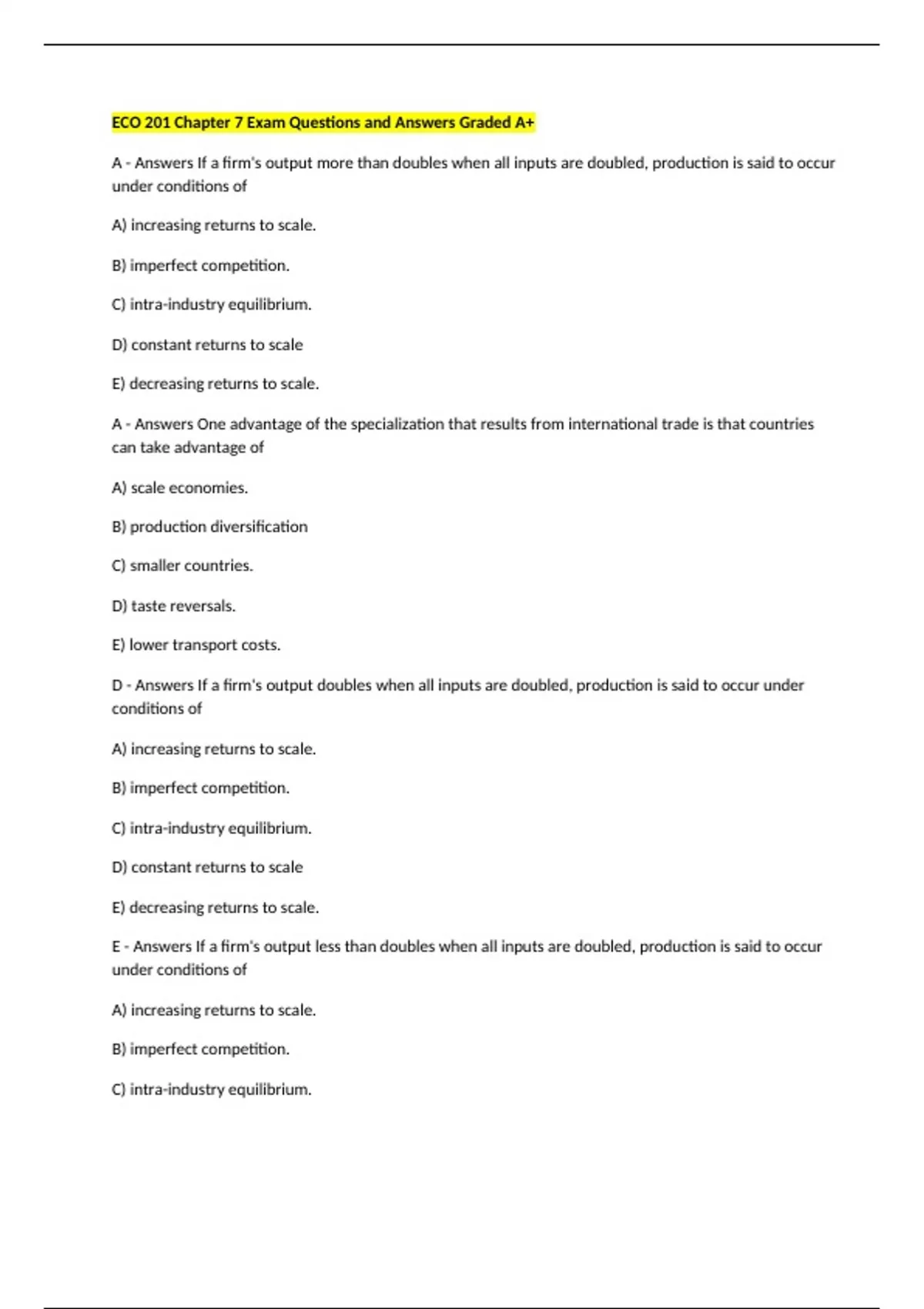 ECO 201 Chapter 7 Exam Questions and Answers Graded A+ A - Answers If a firm's output more than doubles when all inputs are doubled, production is said to occur under conditions of A) increasing returns to scale. B) imperfect competition. C) intra-industry equilibrium. D) constant returns to scale E) decreasing returns to scale. A - Answers One advantage of the specialization that results from international trade is that countries can take advantage of A) scale economies. B) production diversification C) smaller countries. D) taste reversals. E) lower transport costs. D - Answers If a firm's output doubles when all inputs are doubled, production is said to occur under conditions of A) increasing returns to scale. B) imperfect competition. C) intra-industry equilibrium. D) constant returns to scale E) decreasing returns to scale. E - Answers If a firm's output less than doubles when all inputs are doubled, production is said to occur under conditions of A) increasing returns to scale. B) imperfect competition. C) intra-industry equilibrium. D) constant returns to scale E) decreasing returns to scale. A - Answers The existence of external economies of scale A) may be associated with a perfectly competitive industry. B) cannot be associated with a perfectly competitive industry. C) tends to result in one huge monopoly. D) tends to result in large profits for each firm. E) focuses more on individual firms than the industry as a whole. A - Answers The existence of internal economies of scale A) cannot be associated with a perfectly competitive industry.