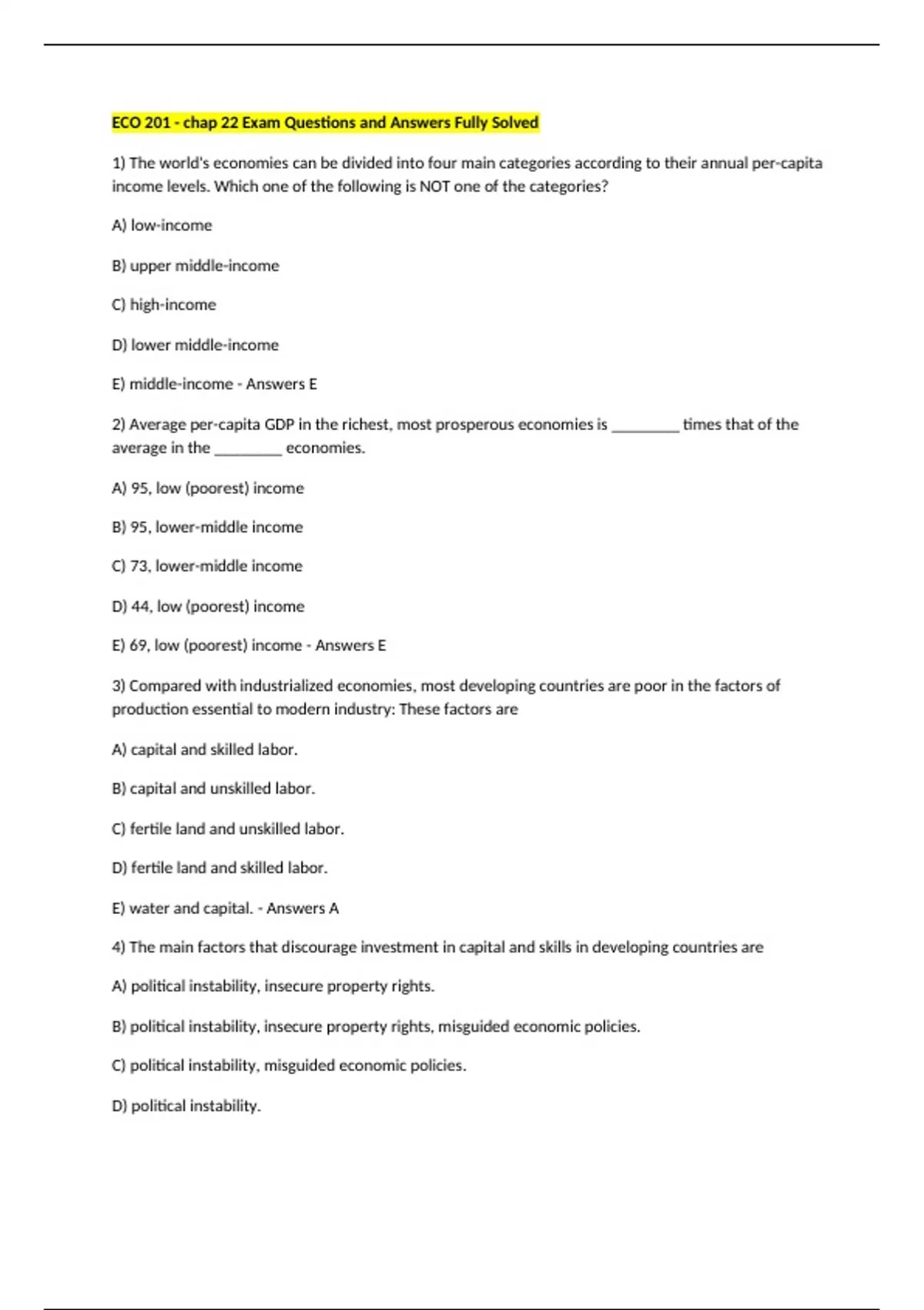 ECO 201 - chap 22 Exam Questions and Answers Fully Solved 1) The world's economies can be divided into four main categories according to their annual per-capita income levels. Which one of the following is NOT one of the categories? A) low-income B) upper middle-income C) high-income D) lower middle-income E) middle-income - Answers E 2) Average per-capita GDP in the richest, most prosperous economies is ________ times that of the average in the ________ economies. A) 95, low (poorest) income B) 95, lower-middle income C) 73, lower-middle income D) 44, low (poorest) income E) 69, low (poorest) income - Answers E 3) Compared with industrialized economies, most developing countries are poor in the factors of production essential to modern industry: These factors are A) capital and skilled labor. B) capital and unskilled labor. C) fertile land and unskilled labor. D) fertile land and skilled labor. E) water and capital. - Answers A 4) The main factors that discourage investment in capital and skills in developing countries are A) political instability, insecure property rights. B) political instability, insecure property rights, misguided economic policies. C) political instability, misguided economic policies. D) political instability. E) insecure property rights, misguided economic policies. - Answers B 5) The per-capita GNP of the industrial group is about ________ times that of the upper middle-income countries. A) 6 B) 10 C) 15 D) 19 E) 2 - Answers A 6) When one compares per-capital output growth rates among countries A) one needs to correct the data to account for departures from purchasing power parity. B) such corrections are often not necessary. C) such corrections are sometimes necessary. D) the evidence whether such corrections are necessary are vague. E) such corrections are not necessary. - Answers A 7) Over the period , the United States economy grew at roughly A) 2.1 percent. B) 3 percent. C) 4 percent. D) one percent. E) 3.5 percent. - Answers A 8) Over the period , France grew ________ than the United States economy A) 2 % slower. B) 2% faster. C) more than 2% slower. D) less than 2% faster. E) more than 2% faster. - Answers D 9) Over the post-war era, the gaps between industrial countries' living stand