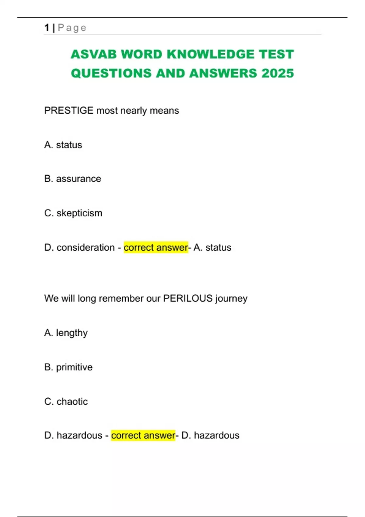 ASVAB WORD KNOWLEDGE TEST QUESTIONS AND ANSWERS 2025