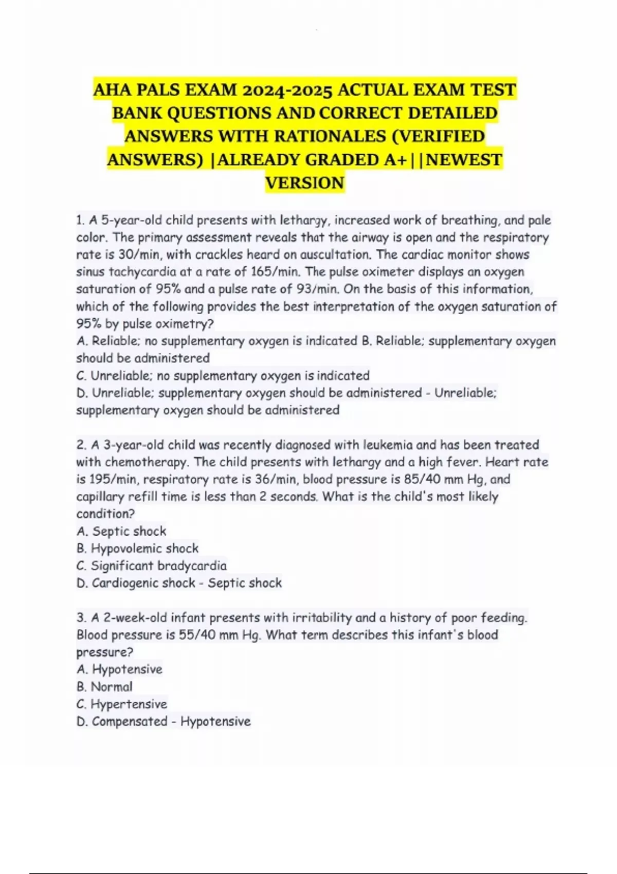 AHA PALS EXAM ACTUAL EXAM TEST BANK QUESTIONS AND CORRECT DETAILED ANSWERS WITH RATIONALES (VERIFIED ANSWERS) ALREADY GRADED A+NEWEST VERSION !!!