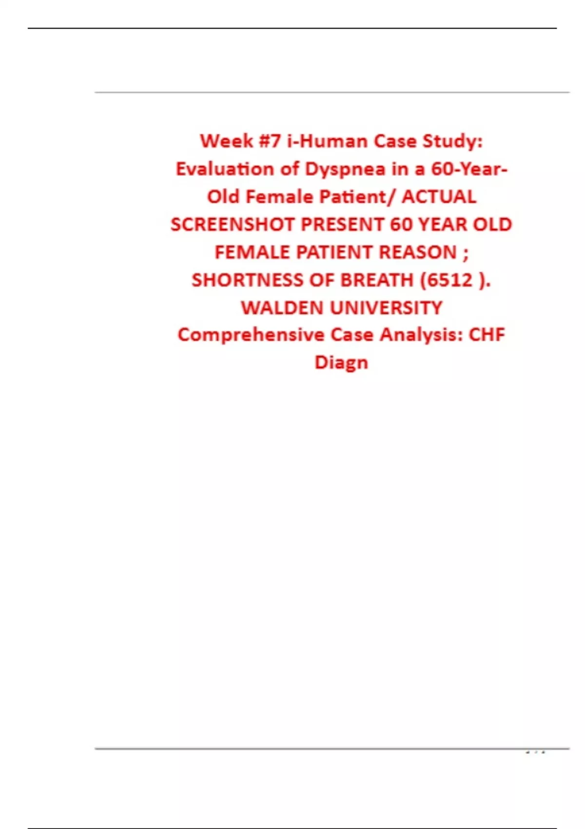 Week #7 i-Human Case Study: Evaluation of Dyspnea in a 60-Year-Old Female Patient/WEEK #7 CASE STUDY ACTUAL SCREENSHOT PRESENT 60 YEAR OLD FEMALE PATIENT REASON ; SHORTNESS OF BREATH (6512 ). WALDEN UNIVERSITY Comprehensive Case Analysis: CHF Diagn,