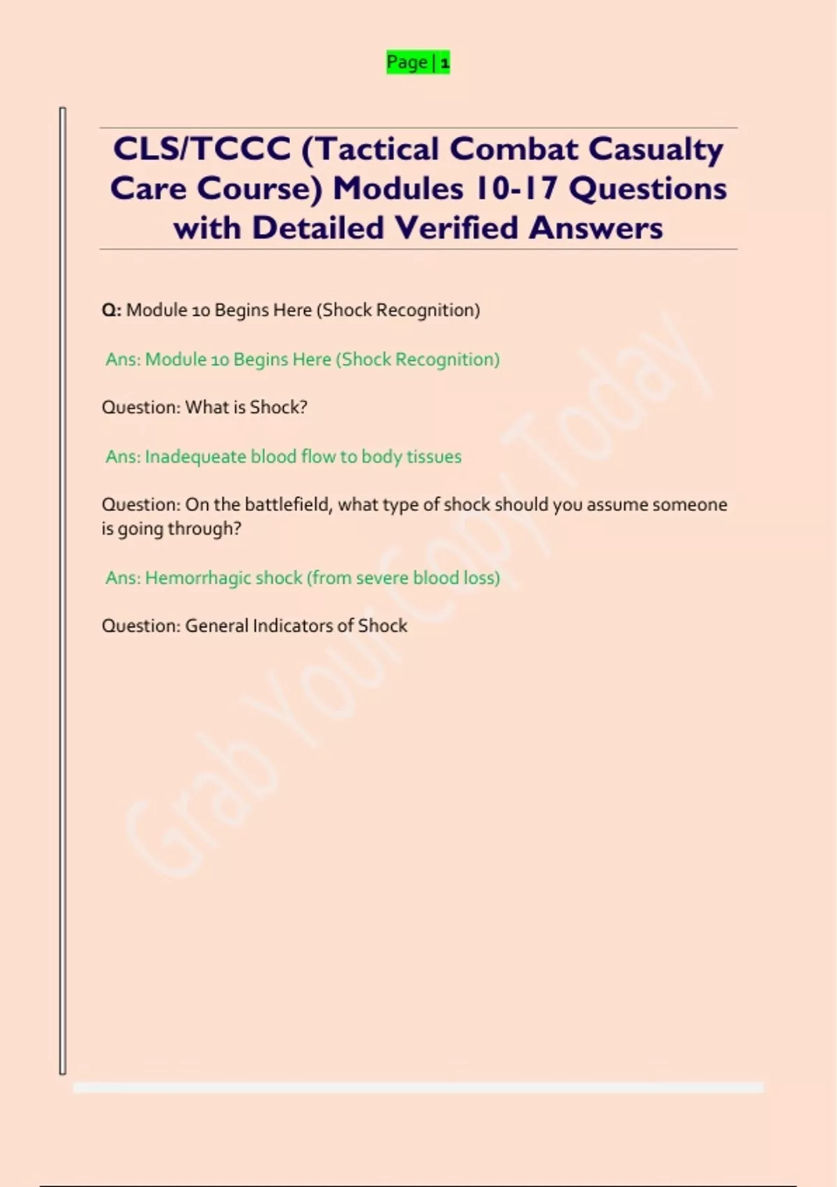 CLS/TCCC (Tactical Combat Casualty Care Course) Modules 10-17 Questions with Detailed Verified Answers CLS/TCCC (Tactical Combat Casualty Care Course) Modules 10-17 Questions with Detailed Verified Answers