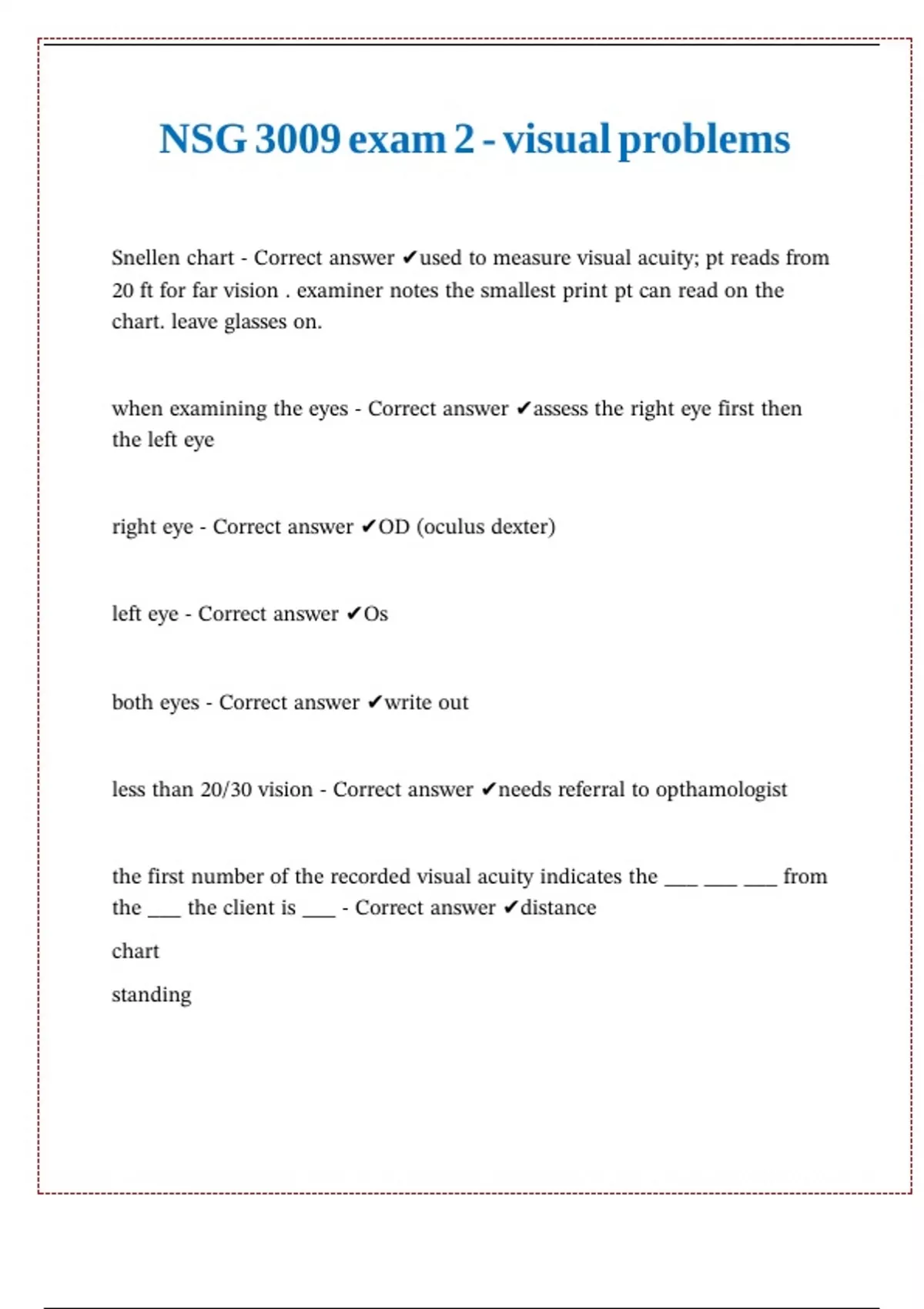 Snellen chart - Correct answer ✔used to measure visual acuity; pt reads from
