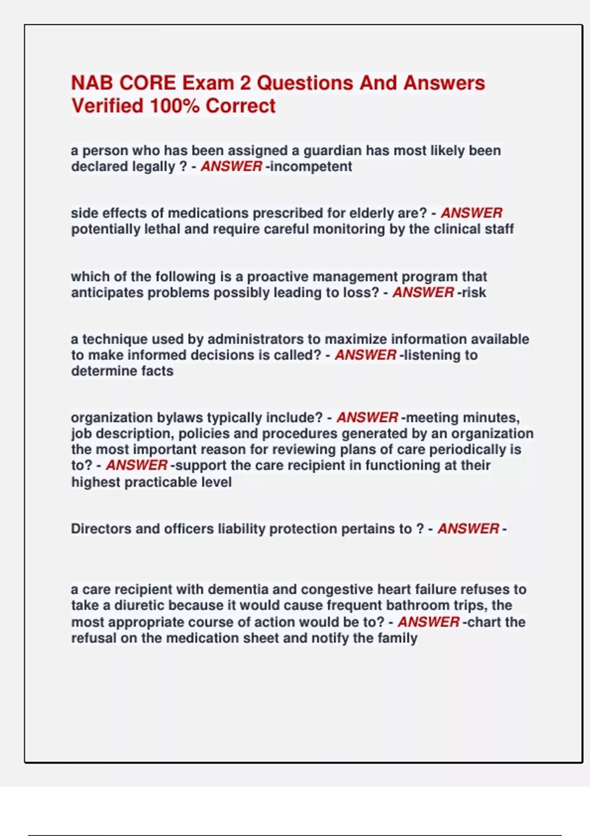 NAB CORE Exam 2 Questions And Answers Verified 100% Correct a person who has been assigned a guardian has most likely been declared legally ? - ANSWER -incompetent side effects of medications prescribed for elderly are? - ANSWER potentially lethal and require careful monitoring by the clinical staff which of the following is a proactive management program that anticipates problems possibly leading to loss? - ANSWER -risk a technique used by administrators to maximize information available to make informed decisions is called? - ANSWER -listening to determine facts organization bylaws typically include? - ANSWER -meeting minutes, job description, policies and procedures generated by an organization the most important reason for reviewing plans of care periodically is to? - ANSWER -support the care recipient in functioning at their highest practicable level Directors and officers liability protection pertains to ? - ANSWER - a care recipient with dementia and congestive heart failure refuses to take a diuretic because it would cause frequent bathroom trips, the most appropriate course of action would be to? - ANSWER -chart the refusal on the medication sheet and notify the family what type of employee insurance premium must be paid entirely by the employer? - ANSWER -workers compensation which document empowers a person to make legal or financial decisions on behalf of a permanently or temporarily incapacitated person? - ANSWER -power of attorney hospital beds, oxygen concentrators, and bedside commodes are considered what type of equipment ? - ANSWER -durable medical the term that describes the union and management engagement in a genuine process to reach an agreement even though there is no guarantee that an agreement can be reached is ? - ANSWER collective bargaining the occupational safety and health administration (OSHA) 300 form must be posted and displayed in a prominent location for employers with a minimum of how many employees? - ANSWER -11 the major cause of exposure to infection is ? - ANSWER -inadequate sanitation in food areas in addition to identifying the correct care recipients, the five "right" of medication administration also include identifying the correct? - ANSWER -medication, dose, time and route which of the following aspects if memory loss is an early sign of Alzheimer's type of dementia? - ANSWER -procedural memory a profit and loss statement is sometimes referred to as a/n ? - ANSWER -income statement the most important objective of a recipients plan of care is to? - ANSWER -coordinate and deliver services a care recipient with advanced dementia has lost the ability to eat and drink. the recipients daughter does not have a medical power of attorney but is requesting a feeding tube for her mother. this is an example of ? - ANSWER -ethical dilemma a competent care recipient insists on self-administration of medications. the first step should be to? - ANSWER -assess the care recipient's ability to practice safe self administration safety data sheet (SDS) are requirement of the - ANSWER occupational safety and health administration (OSHA) injuries to the skin or other underlying structures caused by the lack of blood flow to the area due to environmental constriction are referred to as? - ANSWER -vascular wounds which document empowers a person to make legal or financial decisions on behalf of permanently or temporarily incapacitated person? - ANSWER -power of attorney for care recipient who elect the hospice benefits, medicare covers? - ANSWER -100% of hospice services related to the qualified diagnosis the most effective way to control long-term capital replacement cost is through ? - ANSWER -preventive maintenance programs