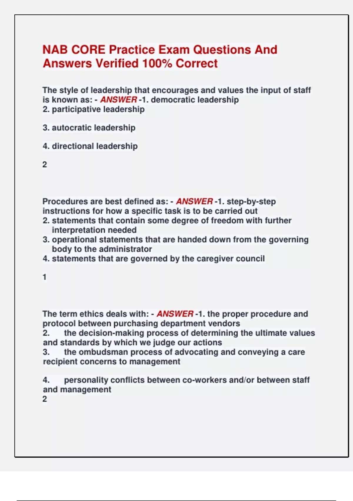 NAB CORE Practice Exam Questions And Answers Verified 100% Correct The style of leadership that encourages and values the input of staff is known as: - ANSWER -1. democratic leadership 2. participative leadership 3. autocratic leadership 4. directional leadership 2 Procedures are best defined as: - ANSWER -1. step-by-step instructions for how a specific task is to be carried out 2. statements that contain some degree of freedom with further interpretation needed 3. operational statements that are handed down from the governing body to the administrator 4. statements that are governed by the caregiver council 1 The term ethics deals with: - ANSWER -1. the proper procedure and protocol between purchasing department vendors 2. the decision-making process of determining the ultimate values and standards by which we judge our actions 3. the ombudsman process of advocating and conveying a care recipient concerns to management 4. personality conflicts between co-workers and/or between staff and management 2 Principles that reflect the moral foundation and guiding ideology of an organization are best described as its: - ANSWER -1. philosophy 2. mission 3. vision 4. values 4 When a family is being interviewed regarding a provision of services, the first course of action should be to: - ANSWER -1. discuss the healthcare organization's rate structure 2. inquire about the potential care recipient's needs 3. give tour of the healthcare organization 4. talk about the healthcare organization's strengths compared to the competition's 2 When marketing a healthcare organization, the market is considered to be all of the individuals: - ANSWER -1. living within an established radius of the healthcare organization 2. enrolled in the Medicaid or Medicare programs 3. with a demand for their service of product 4. discharging from an acute care hospital 3 Ethics are the beliefs or attitudes that make up which kind of organizational values? - ANSWER -1. Humanitarian 2. Religious 3. Moral 4. Civic 3 A cognitive care recipient, whose spouse is living, does not have an advance directive or a Do Not Resuscitate (DNR) order. The care recipient's daughter has financial Power of Attorney, and the son has Healthcare of Power of Attorney. A DNR order can be authorized by the: - ANSWER -1. care recipient's son 2. care recipient 3. care recipient's spouse 4. physician 1 Establishing and Implementing policies regarding the management and operations of a healthcare organization is the responsibility of the: - ANSWER -1. department managers 2. chief executive officer 3. care recipient 4. governing body 2