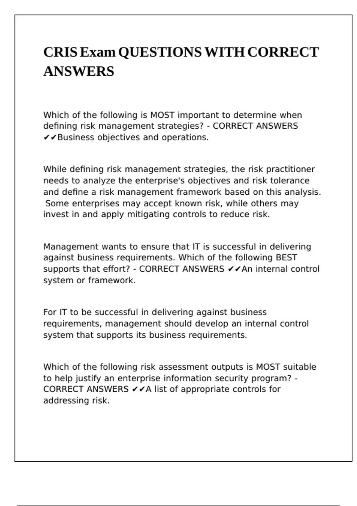 enterprise's risk practices? - CORRECT ANSWERS ✔✔Business |\ |\ |\ |\ |\ |\ |\