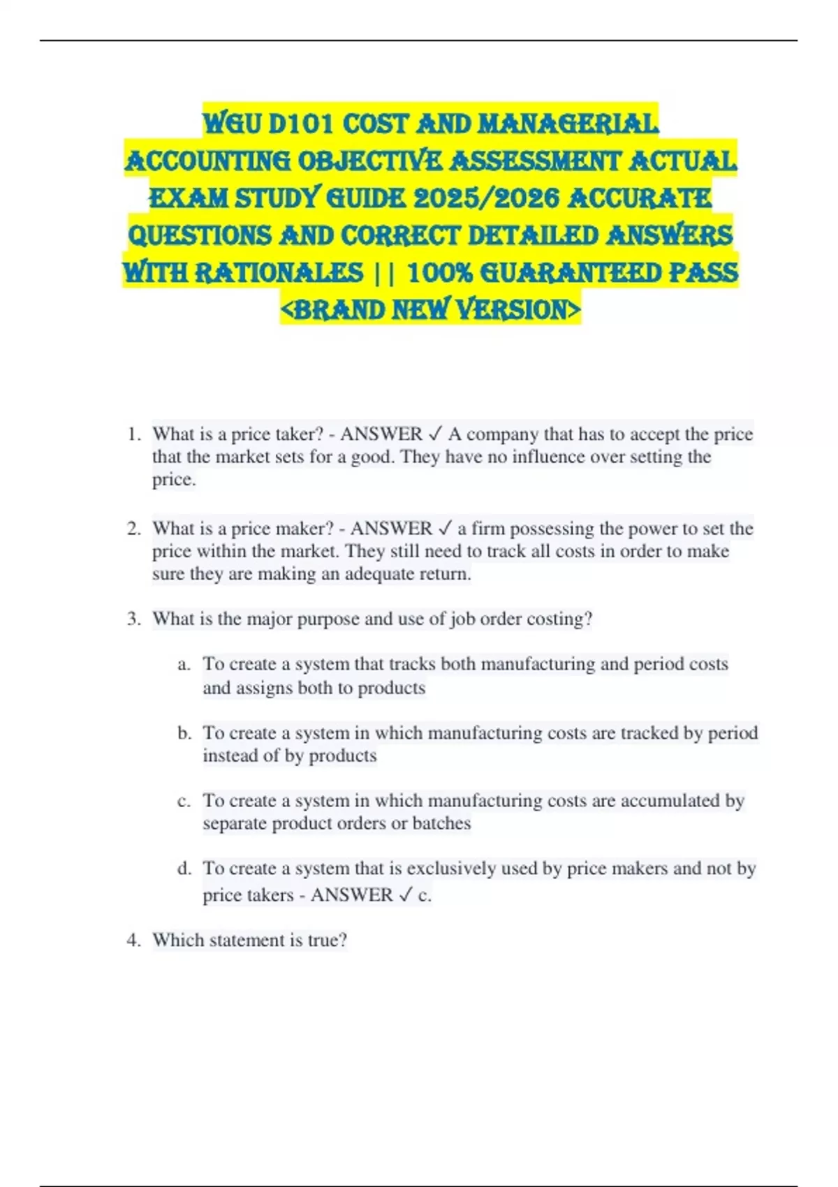 WGU D101 Cost and Managerial Accounting OBJECTIVE ASSESSMENT ACTUAL EXAM STUDY GUIDE 2025/2026 ACCURATE QUESTIONS AND CORRECT DETAILED ANSWERS WITH RATIONALES || 100% GUARANTEED PASS BRAND NEW VERSION 1. What is a price taker? - ANSWER A company that has to accept the price that the market sets for a good. They have no influence over setting the price. 2. What is a price maker? - ANSWER a firm possessing the power to set the price within the market. They still need to track all costs in order to make sure they are making an adequate return. 3. What is the major purpose and use of job order costing? a. To create a system that tracks both manufacturing and period costs and assigns both to products b. To create a system in which manufacturing costs are tracked by period instead of by products c. To create a system in which manufacturing costs are accumulated by separate product orders or batches d. To create a system that is exclusively used by price makers and not by price takers - ANSWER c. 4. Which statement is true? a. Having accurate product or service cost information is important for both price takers and price makers. b. Having accurate product or service cost information is important for price takers, but not price makers. c. Having accurate produce or service cost information is not important for either price takers or price makers. d. Having accurate product or service cost information is important for price makers, but not price takers. - ANSWER a. 5. Which of the following are always considered 100% complete when calculating equivalent units? a. Units in ending work-in-process conversion costs. b. Units started during the period. c. Units started and completed during the period. d. Units in work-in-process for material costs. - ANSWER c. Correct! Units started and completed during the period are always considered 100% completed and are 100% completed all the time. You cannot call them completed units if they are not completed during the period. 6. Using a traditional overhead allocation method, what is a common measure of activity? a. Amount spent on research and development b. CEO salary c. Forecasted sales increase d. Direct labor hours - ANSWER d. Correct! With a traditional overhead allocation method, all overhead is allocated based on one common measure of activity, such as direct labor hours. 7. Using an ABC overhead allocation method, overhead is allocated based on several different measures of activity. What are these measures of activity called? a. Total manufacturing costs b. Direct labor c. Direct materials d. Cost drivers - ANSWER d. Correct! Overhead is allocated based on several different measures of activity, which are called cost drivers. 8. The traditional approach to allocating overhead involves assigning all the overhead costs to products according to which approach? a. Multiple measures of activity b. Using a direct approach c. One simple measure of activity d. Using multiple cost drivers - ANSWER c. Correct! The traditional approach to allocating overhead involves assigning all the overhead costs to products according to one simple measure of activity, such as direct labor or machine hours. 9. What is important to consider when determining how to allocate overhead costs to a product or a production process? a. Determining what factors are causing direct labor costs to be incurred b. Determining what factors are causing all manufacturing costs to be incurred c. Determining what factors are causing direct materials costs to be incurred d. Determining what factors are causing overhead costs to be incurred - ANSWER d. Correct! It is important when determining how to allocate overhead costs to a product or production process to consider what factors are causing overhead costs to be incurred in the manufacturing process in the first place. 10. What is a change, or measurable factor, directly related to the amount of overhead cost associated with the production of a specific item? a. A design change b. A change in direct materials used c. A change in the union contract d. A change in direct labor pay rates - ANSWER a. Correct! A design change is a measurable factor directly related to the amount of overhead cost associated with the production of a specific item. 11. Sales Mix - ANSWER The relative proportion of total sales dollars (or total units sold) that is represented by each of a company's products 12. Selling and Administrative Expense Budget - ANSWER A schedule of all nonproduction spending expected to occur during the budget period 13. Service Organizations - ANSWER Any organization whose main economic activity involves producing a nonphysical product that provides value to a customer 14. Special Order - ANSWER An order that may be priced below the normal selling price to utilize excess capacity and thereby contribute to company profits 15. Standard Cost System - ANSWER A cost-accumulation system in which standard costs are used as product costs instead of actual costs. The standard costs are then adjusted to actual costs when financial reports are created. This adjustment creates variances that are reported to management 16. Standard Costing System - ANSWER A cost-accumulation system in which standard costs are used as product costs instead of actual costs. The standard costs are then adjusted to actual costs when financial reports are created. This adjustment creates variances that are reported to management 17. Standard Quantity Allowed - ANSWER Amount of materials that should have been used to manufacture products in a specific time period 18. Stepped Costs - ANSWER Costs that change in total in a stairstep fashion (in large amounts) with changes in volume of activity 19. Sunk Cost - ANSWER Either past costs or unchangeable future costs that do not change as the result of a future decision 20. When determining how many units are necessary to reach a target level net income, you always add fixed costs and target net income (the amount that needs to be c