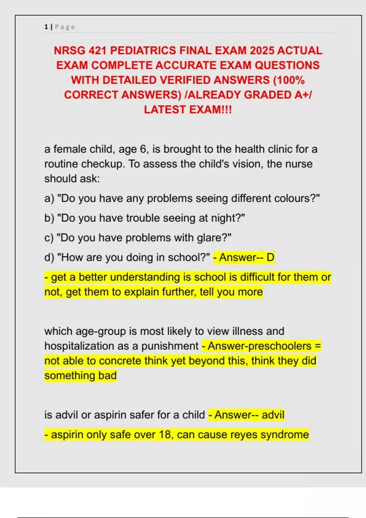 NRSG 421 PEDIATRICS FINAL EXAM 2025 ACTUAL