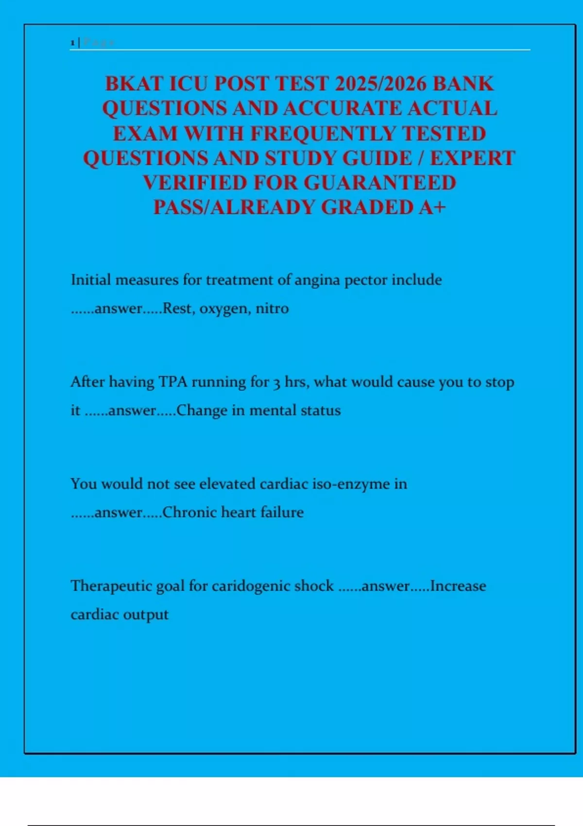 This 2025/2026 BKAT ICU Post Test Bank contains 100% accurate, expert-verified answers and frequently tested exam questions, ensuring guaranteed success and an A+ grade. Designed for ICU nurses, this resource covers critical topics such as: Cardiac emergencies (AMI, VT/VF, cardiogenic shock, pacemakers) Neurological care (ICP management, stroke protocols, sedation) Respiratory interventions (ventilator alarms, chest tubes, pneumothorax) Renal/electrolyte imbalances (hyperkalemia, DKA, ARF) Pharmacology (vasopressors, anticoagulants, insulin, antidotes) Procedures (NG tube placement, ABG interpretation, hemodynamic monitoring) Ideal for NCLEX prep, ICU certification, or clinical practice, this guide includes detailed explanations, EKG interpretations, and mnemonics (e.g., ROME for ABGs).