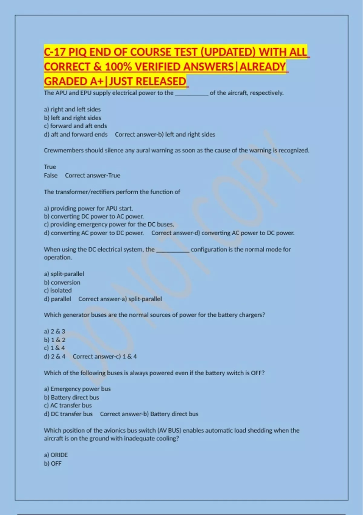 C-17 PIQ END OF COURSE TEST (UPDATED) WITH ALL CORRECT & 100% VERIFIED ANSWERS|ALREADY GRADED A+|JUST RELEASED