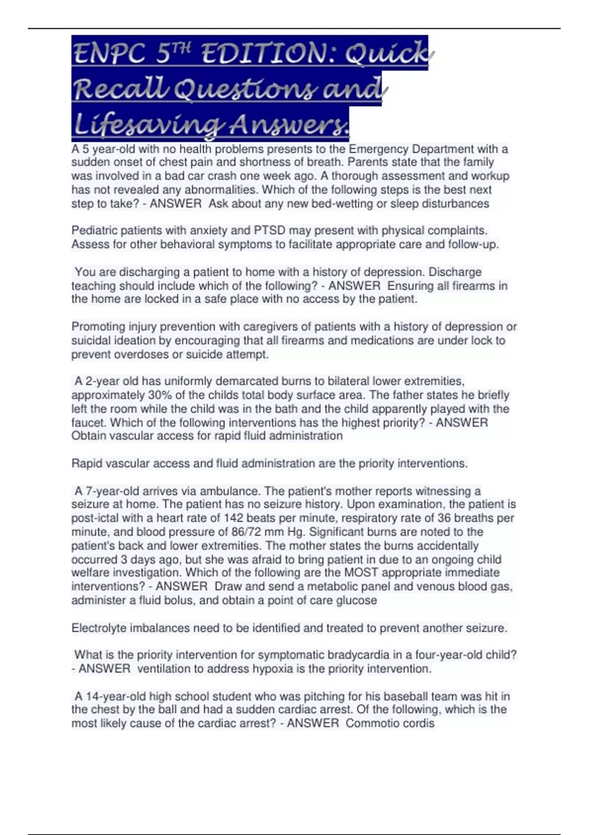 A 5 year-old with no health problems presents to the Emergency Department with a sudden onset of chest pain and shortness of breath. Parents state that the family was involved in a bad car crash one week ago. A thorough assessment and workup has not revealed any abnormalities. Which of the following steps is the best next step to take? - ANSWER Ask about any new bed-wetting or sleep disturbances Pediatric patients with anxiety and PTSD may present with physical complaints. Assess for other behavioral symptoms to facilitate appropriate care and follow-up. You are discharging a patient to home with a history of depression. Discharge teaching should include which of the following? - ANSWER Ensuring all firearms in the home are locked in a safe place with no access by the patient. Promoting injury prevention with caregivers of patients with a history of depression or suicidal ideation by encouraging that all firearms and medications are under lock to prevent overdoses or suicide attempt. A 2-year old has uniformly demarcated burns to bilateral lower extremities, approximately 30% of the childs total body surface area. The father states he briefly left the room while the child was in the bath and the child apparently played with the faucet. Which of the following interventions has the highest priority? - ANSWER Obtain vascular access for rapid fluid administration Rapid vascular access and fluid administration are the priority interventions. A 7-year-old arrives via ambulance. The patient's mother reports witnessing a seizure at home. The patient has no seizure history. Upon examination, the patient is post-ictal with a heart rate of 142 beats per minute, respiratory rate of 36 breaths per minute, and blood pressure of 86/72 mm Hg. Significant burns are noted to the patient's back and lower extremities. The mother states the burns accidentally occurred 3 days ago, but she was afraid to bring patient in due to an ongoing child welfare investigation. Which of the following are the MOST appropriate immediate interventions? - ANSWER Draw and send a metabolic panel and venous blood gas, administer a fluid bolus, and obtain a point of care glucose