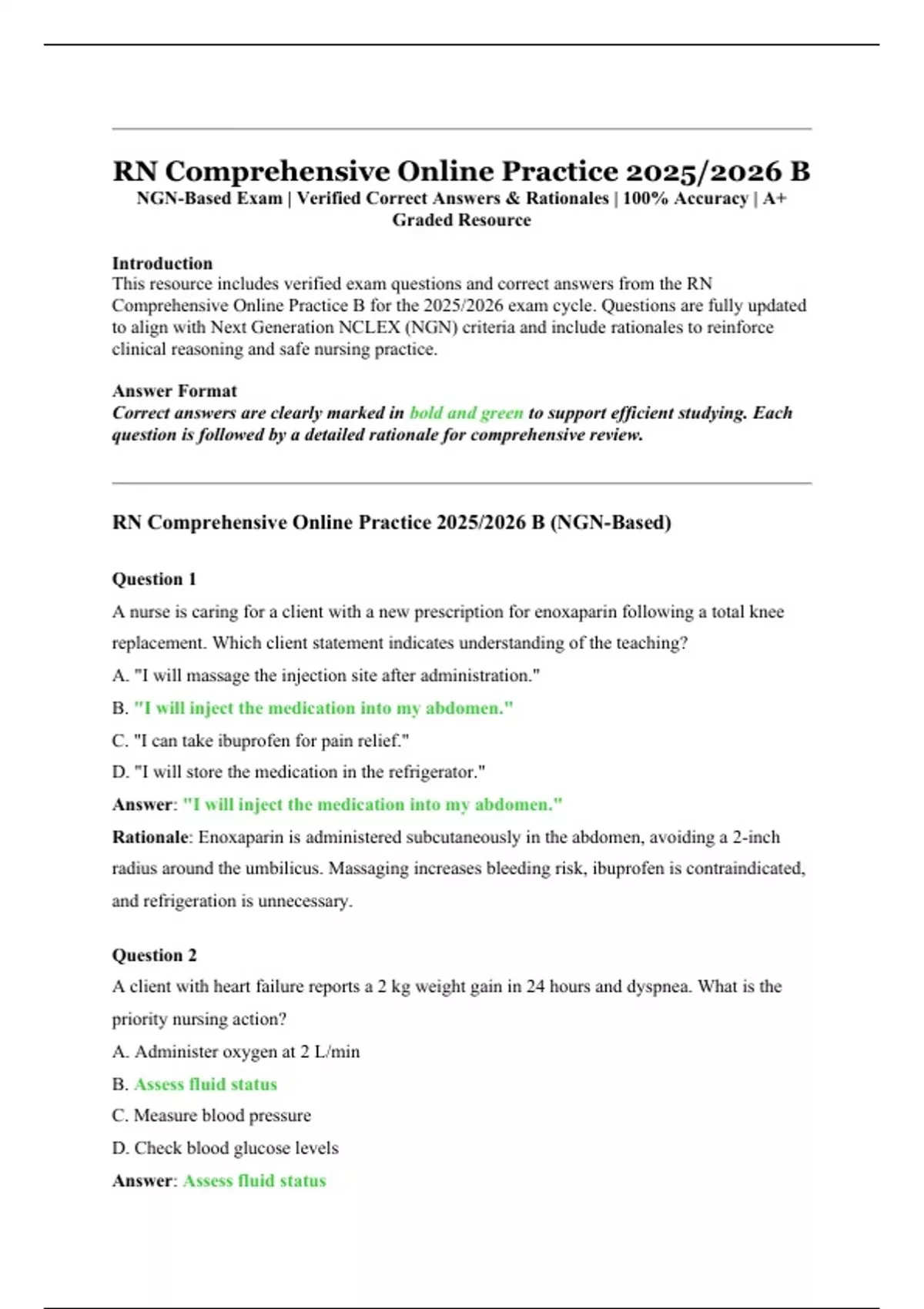 This 2025/2026 resource provides verified questions and 100% correct answers from the RN Comprehensive Online Practice B exam, aligned with Next Generation NCLEX (NGN) standards. Each question includes a detailed rationale to reinforce clinical reasoning, prioritization, and safe nursing practice. Designed for nursing students preparing for the NCLEX-RN®, this material covers critical content areas including pharmacology, patient care, infection control, and evidence-based interventions.
