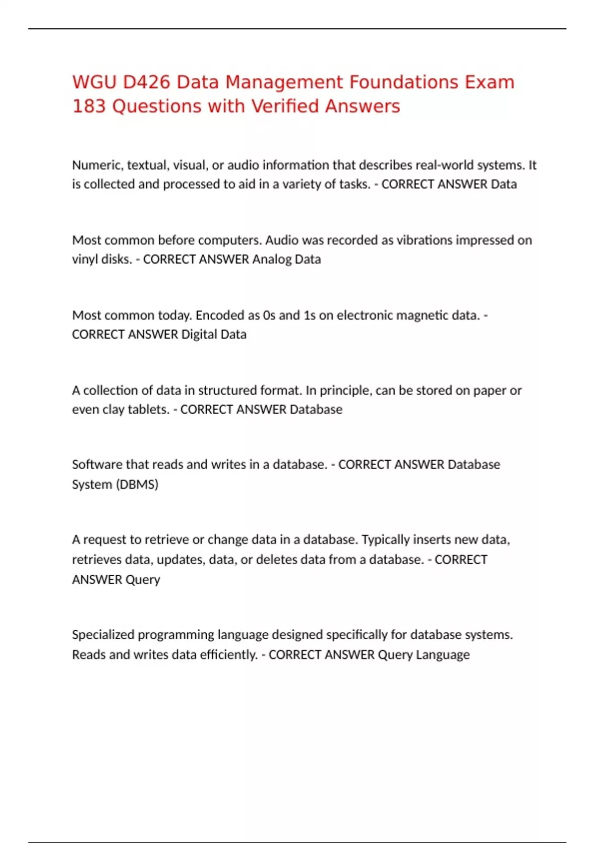 WGU D426 Data Management Foundations Exam 183 Questions with Verified Answers Numeric, textual, visual, or audio information that describes real-world systems. It is collected and processed to aid in a variety of tasks. - CORRECT ANSWER Data Most common before computers. Audio was recorded as vibrations impressed on vinyl disks. - CORRECT ANSWER Analog Data Most common today. Encoded as 0s and 1s on electronic magnetic data. - CORRECT ANSWER Digital Data A collection of data in structured format. In principle, can be stored on paper or even clay tablets. - CORRECT ANSWER Database Software that reads and writes in a database. - CORRECT ANSWER Database System (DBMS) A request to retrieve or change data in a database. Typically inserts new data, retrieves data, updates, data, or deletes data from a database. - CORRECT ANSWER Query Specialized programming language designed specifically for database systems. Reads and writes data efficiently. - CORRECT ANSWER Query Language Software that HELPS business users interact with database systems. - CORRECT ANSWER Database Application What role am I? Responsible for securing the database system against unauthorized users. They enforce procedures for user access and database system availability. - CORRECT ANSWER Database Administrator What role am I? Determines the format of each data element AND the overall database STRUCTURE. Must balance priorities like including storage, response time, and support for rules that govern the data. - CORRECT ANSWER Database Designer What role am I?