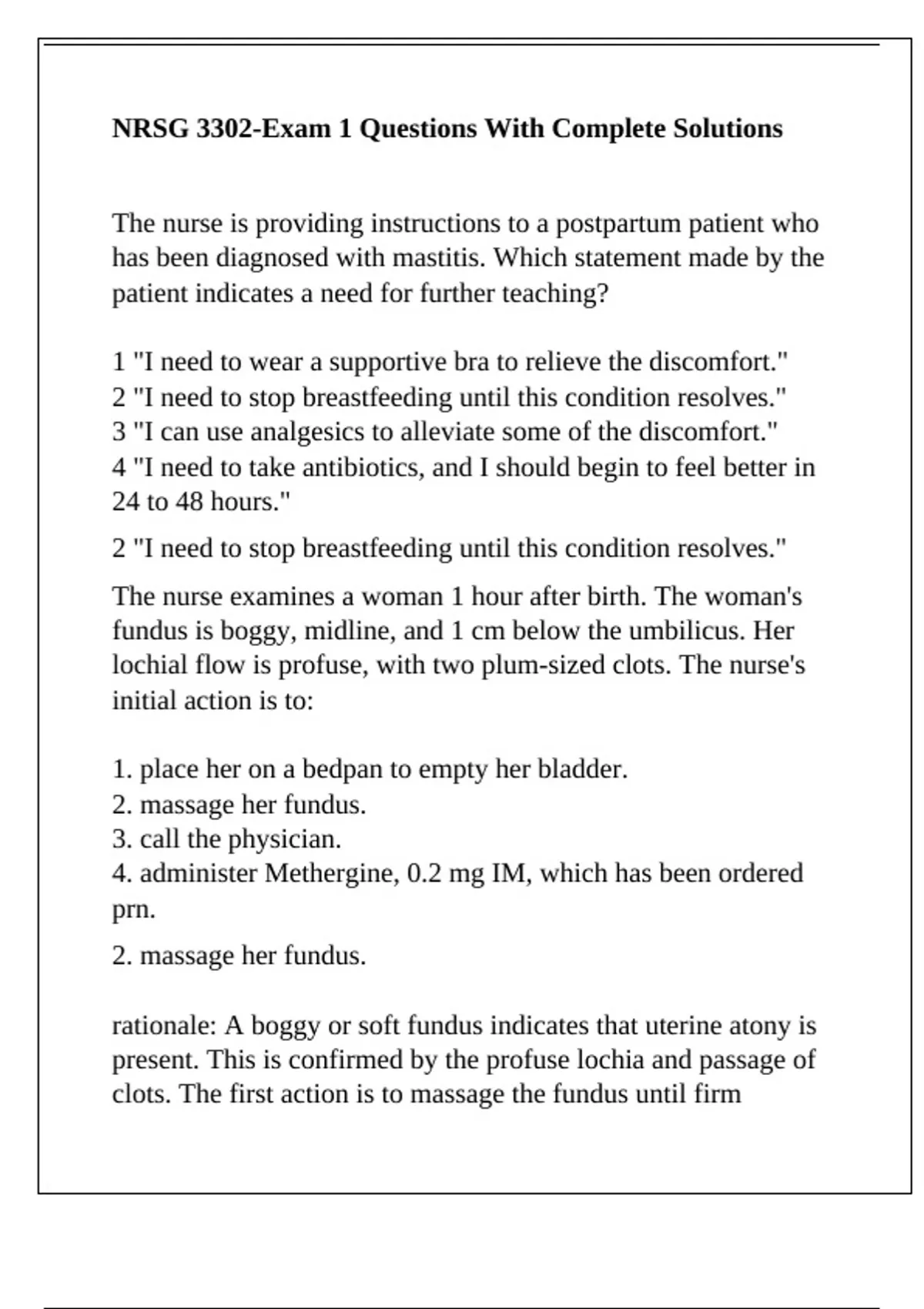 rationale: A boggy or soft fundus indicates that uterine atony is