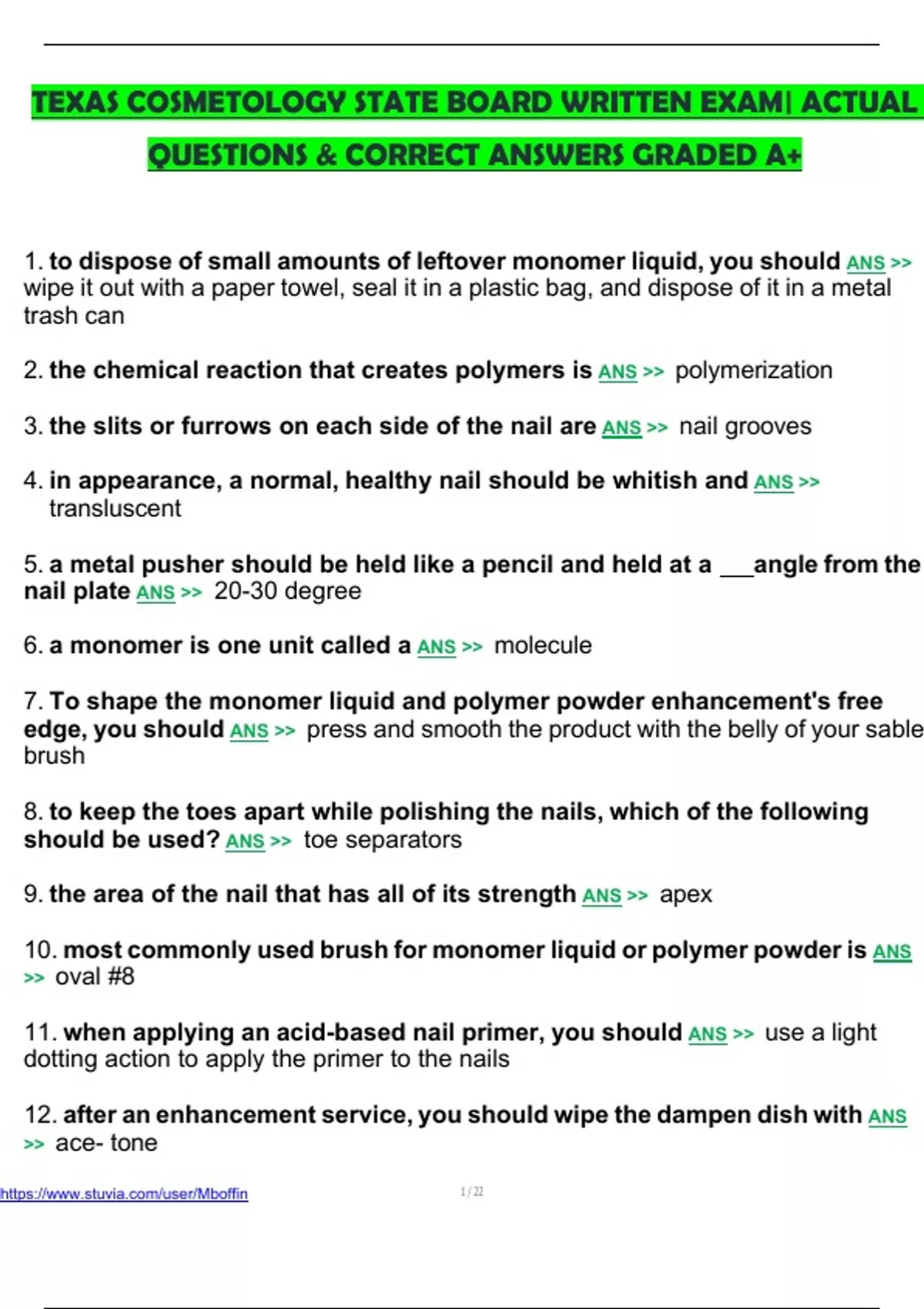 TEXAS COSMETOLOGY STATE BOARD WRITTEN EXAM| ACTUAL QUESTIONS & CORRECT ANSWERS GRADED A+ 1. to dispose of small amounts of leftover monomer liquid, you should ANS wipe it out with a paper towel, seal it in a plastic bag, and dispose of it in a metal trash can 2. the chemical reaction that creates polymers is ANS polymerization 3. the slits or furrows on each side of the nail are ANS nail grooves 4. in appearance, a normal, healthy nail should be whitish and ANS transluscent 5. a metal pusher should be held like a pencil and held at a angle from the nail plate ANS 20-30 degree 6. a monomer is one unit called a ANS molecule 7. To shape the monomer liquid and polymer powder enhancement's free edge, you should ANS press and smooth the product with the belly of your sable brush 8. to keep the toes apart while polishing the nails, which of the following should be used? ANS toe separators 9. the area of the nail that has all of its strength ANS apex 10. most commonly used brush for monomer liquid or polymer powder is ANS oval #8