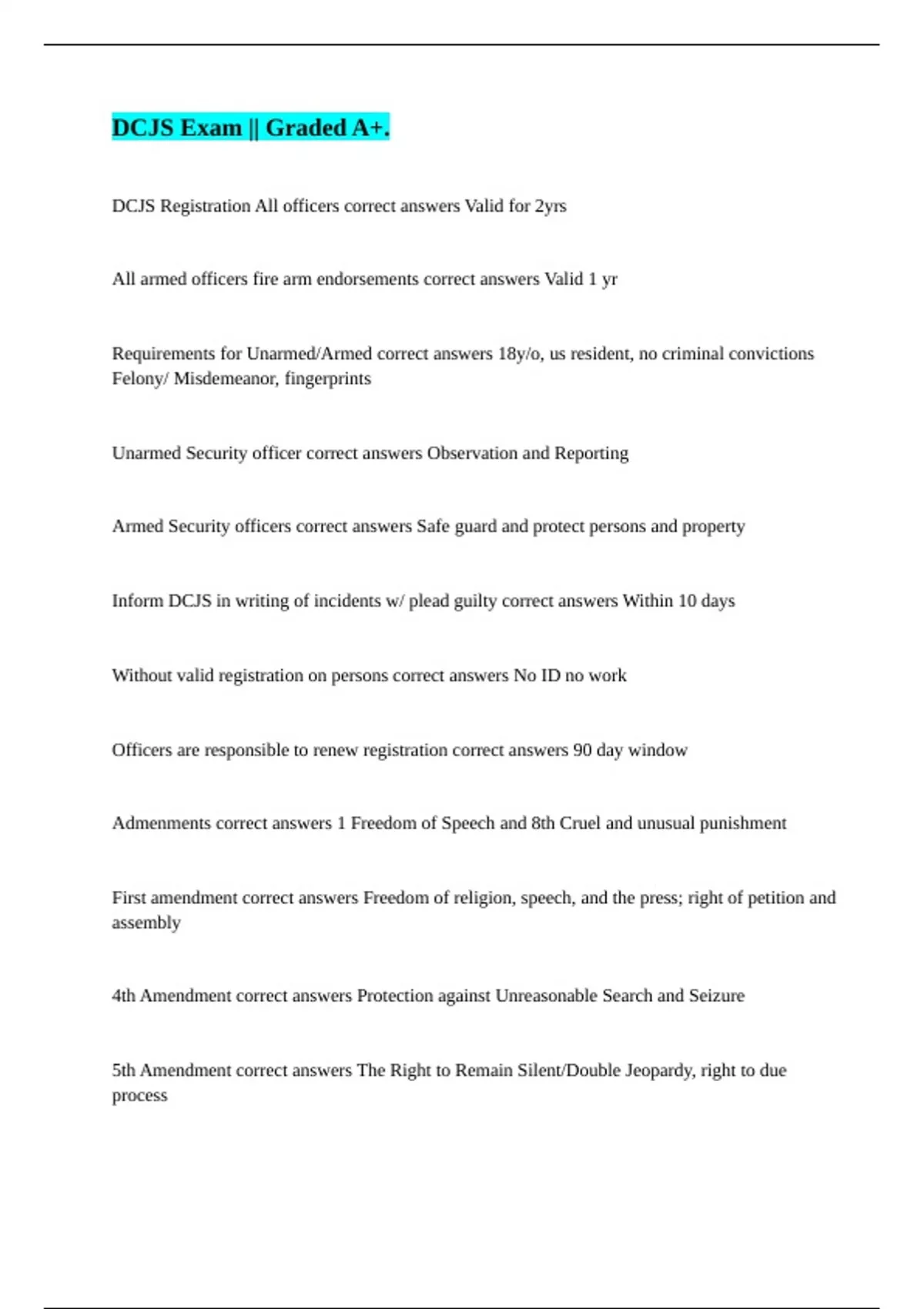 DCJS Registration All officers correct answers Valid for 2yrs All armed officers fire arm endorsements correct answers Valid 1 yr Requirements for Unarmed/Armed correct answers 18y/o, us resident, no criminal convictions Felony/ Misdemeanor, fingerprints Unarmed Security officer correct answers Observation and Reporting Armed Security officers correct answers Safe guard and protect persons and property Inform DCJS in writing of incidents w/ plead guilty correct answers Within 10 days Without valid registration on persons correct answers No ID no work Officers are responsible to renew registration correct answers 90 day window Admenments correct answers 1 Freedom of Speech and 8th Cruel and unusual punishment First amendment correct answers Freedom of religion, speech, and the press; right of petition and assembly 4th Amendment correct answers Protection against Unreasonable Search and Seizure 5th Amendment correct answers The Right to Remain Silent/Double Jeopardy, right to due process