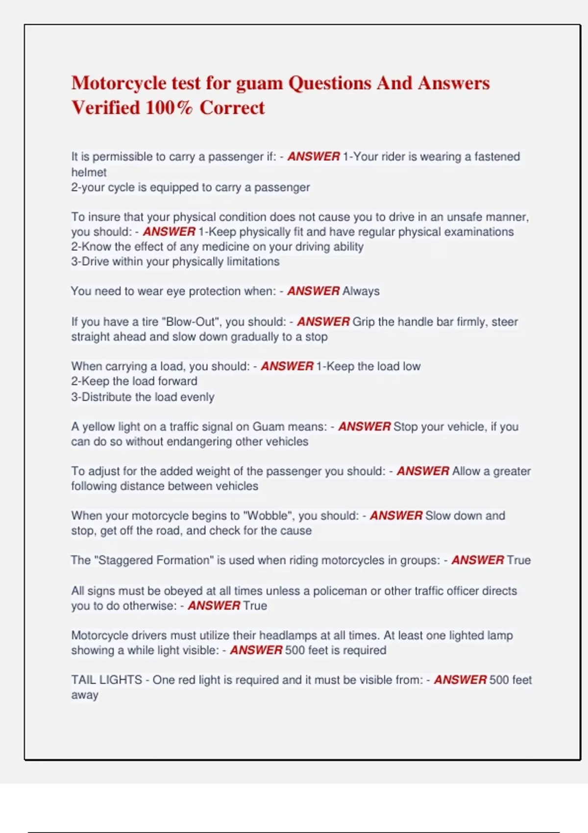 Motorcycle test for guam Questions And Answers Verified 100% Correct It is permissible to carry a passenger if: - ANSWER 1-Your rider is wearing a fastened helmet 2-your cycle is equipped to carry a passenger To insure that your physical condition does not cause you to drive in an unsafe manner, you should: - ANSWER 1-Keep physically fit and have regular physical examinations 2-Know the effect of any medicine on your driving ability 3-Drive within your physically limitations You need to wear eye protection when: - ANSWER Always If you have a tire "Blow-Out", you should: - ANSWER Grip the handle bar firmly, steer straight ahead and slow down gradually to a stop When carrying a load, you should: - ANSWER 1-Keep the load low 2-Keep the load forward 3-Distribute the load evenly A yellow light on a traffic signal on Guam means: - ANSWER Stop your vehicle, if you can do so without endangering other vehicles To adjust for the added weight of the passenger you should: - ANSWER Allow a greater following distance between vehicles When your motorcycle begins to "Wobble", you should: - ANSWER Slow down and stop, get off the road, and check for the cause The "Staggered Formation" is used when riding motorcycles in groups: - ANSWER True All signs must be obeyed at all times unless a policeman or other traffic officer directs you to do otherwise: - ANSWER True Motorcycle drivers must utilize their headlamps at all times. At least one lighted lamp showing a while light visible: - ANSWER 500 feet is required TAIL LIGHTS - One red light is required and it must be visible from: - ANSWER 500 feet away STOP LIGHT - One red light is required and it must be visible from: - ANSWER 500 feet away FOOTRESTS - Footrest for driver and passenger: - ANSWER Are required Handlebars more than 15 inches above the seat are: - ANSWER Illegal Chain should not sag more than: - ANSWER 3/4 inch with your weight on bike Guam law requires headlight to be on when operating the motorcycle. - ANSWER True Know where the lead driver in a staggered formation goes after passing a car: - ANSWER Left side of the lane Passengers are required to keep feet on footrests at all times when the cycle is stopped - ANSWER True What is the best helmet fastener? - ANSWER A ring fastener Minimum age for motorcycle license: - ANSWER 16 If you wear glasses you must also wear a face shield. - ANSWER True DUI is what kind of offense: - ANSWER Misdemeanor How many rear view mirrors are required: - ANSWER Two What should you see in the mirror: - ANSWER About half of your lane and part of the next lane Rear view mirror should reflect a view for: - ANSWER 200 feet Driving in Guam is a privilege: Granted by the territory according to the ruling of the courts. - ANSWER True Failure or unwilling to submit a breath of blood test for DUI purposes: - ANSWER Suspension of driving privileges or forfeiture of license for 6 months When driving on bad roads, a motorcycle rider should take appropriate action by: - ANSWER Adjusting riding speed and techniques to the road conditions When riding a motorcycle appropriate protective clothing should be worn: - ANSWER - during competition, riding in the rain, and at night It is a good idea to "Blink: the brake light when slowing down. - ANSWER True Valid period of the Driver's License: - ANSWER 3 years Chapter 18 Safe Street Act - ANSWER Every person who is convicted of a violation shall be punished by imprisonment for not less than 48hrs and not more than 1 yr or a fine of not less than $1000 and not more than $5000. Such fine and imprisonment and the privilege of such person to operate a motor vehicle shall be suspended by the court for not less than 6 months When riding in a group, inexperienced riders should position themselves: - ANSWER Just behind the leader If you wait one hour per drink for the alcohol to be eliminated from your body before riding: - ANSWER Side effects from the drinking may still remain It is most important to flash your brake light when: - ANSWER You will be slowing suddenly The front brake supplies how much of the potential stopping power? - ANSWER About three-quarters A plastic shatter-resistant face shield: - ANSWER Helps protect your whole face More than half of all crashes: - ANSWER Involve riders who have less than five months of experience on their motorcycle When riding, you should: - ANSWER Turn just your head and eyes to look where you are going To reduce your reaction time, you should: - ANSWER Cover the clutch and the brakes Making eye contact with other drivers: - ANSWER Doesn't mean that the driver will yield The best way to stop quickly is to: - ANSWER Use both brakes at the same time If your motorcycle starts to wobble: - ANSWER Grip the handle bars firmly and close the throttle Passengers should: - ANSWER Lean as you lean