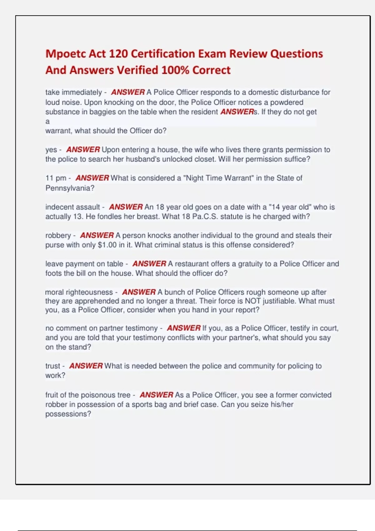 Mpoetc Act 120 Certification Exam Review Questions And Answers Verified 100% Correct