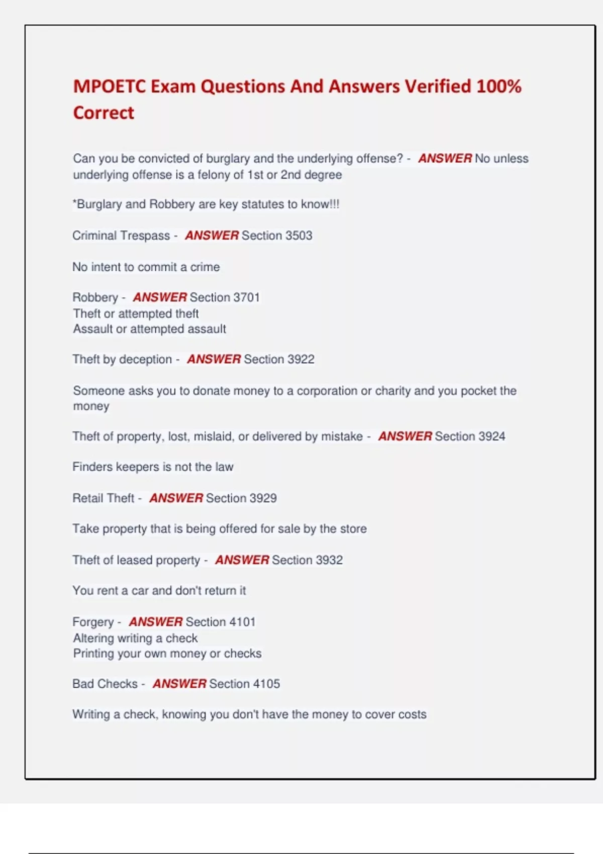 MPOETC Exam Questions And Answers Verified 100% Correct Can you be convicted of burglary and the underlying offense? - ANSWER No unless underlying offense is a felony of 1st or 2nd degree *Burglary and Robbery are key statutes to know!!! Criminal Trespass - ANSWER Section 3503 No intent to commit a crime Robbery - ANSWER Section 3701 Theft or attempted theft Assault or attempted assault Theft by deception - ANSWER Section 3922 Someone asks you to donate money to a corporation or charity and you pocket the money Theft of property, lost, mislaid, or delivered by mistake - ANSWER Section 3924 Finders keepers is not the law Retail Theft - ANSWER Section 3929 Take property that is being offered for sale by the store Theft of leased property - ANSWER Section 3932 You rent a car and don't return it Forgery - ANSWER Section 4101 Altering writing a check Printing your own money or checks Bad Checks - ANSWER Section 4105 Writing a check, knowing you don't have the money to cover costs False reports to law enforcement authorities - ANSWER Section 4906 Implicate somebody else for a crime Reporting a crime that didn't happen Burning your car and reporting it stolen Hindering apprehension or prosecution - ANSWER Section 5105 An accessory to someone to committed a crime. Have to know they committed a crime Disorderly Conduct - ANSWER Section 5503 Intentionally or recklessly causing public inconvenience Summary offense or M3 if they intent to cause serious inconvenience Loitering and prowling at night time - ANSWER Section 5506 Peeping toms Persons not to possess, use, manufacture, control, sell or transfer firearms - ANSWER Anyone convicted of a felony If you were convicted of simple assault you can still possess a firearm No waiting time in PA Purpose of Title 18 - ANSWER Forbid or prevent conduct that harms people without justification Totality of Circumstances - ANSWER Examination of all the facts going into an arrest Three sources of Facts and Circumstances which can be used to establish Probable Cause for arrest - ANSWER Observation made by the officer Receiving information that the officer receives from others Ex. statements from witnesses Info that the officer receives through investigation Types of Warrants - ANSWER Body Warrant Warrant for fine and cost Duplicate Warrant t Re-issued warran John Doe warrant Bench Warrant *Also not on the test but good to know Custodial Detention - ANSWER An arrest Stop and Frisk Rule - ANSWER Outer layer of clothing, no pockets or schoolbags ARD - ANSWER DUI's and misdemeanor offenses Issuance of a Citation - ANSWER Officer has 5 days, defendant has 10 days Issuance of a Warrant - ANSWER When citation or summons is returned undelivered. Bench warrant received when citation or summons was given personally or by mail and has failed to appear for an execution of a sentence. Withdrawal of Charges in Summary Cases - ANSWER Officer can use discretion and withdrawal any number of citations before the closing of a summary trial Notice of Appeal - ANSWER Judge must notify defendant of their right to appeal. Trial de novo Instituting Proceedings in Court Cases - ANSWER Filing a written complaint or an arrest without a warrant Types of Release on Bail - ANSWER ROR Non-monetary Unsecured Bail Monetary Condition Nominal Bail Preliminary Arraignment - ANSWER First step in criminal justice system. Charges and evidence are brought forward to the court. Defendant must have prelim arraignment within a reasonable amount of time. Burden of proof is prima facie Information, Filing, Contents, Function - ANSWER Defendant is formally charged with criminal offenses Who holds the burden of proof in a criminal proceeding? - ANSWER Prosecution or Commonwealth Guilty Pleas - ANSWER A necessary requirement in CJ system. Expedites the system and saves money and time Terry Frisk - ANSWER Reasonable suspicion that criminal activity is afoot Reasonable suspicion that person is armed and dangerous