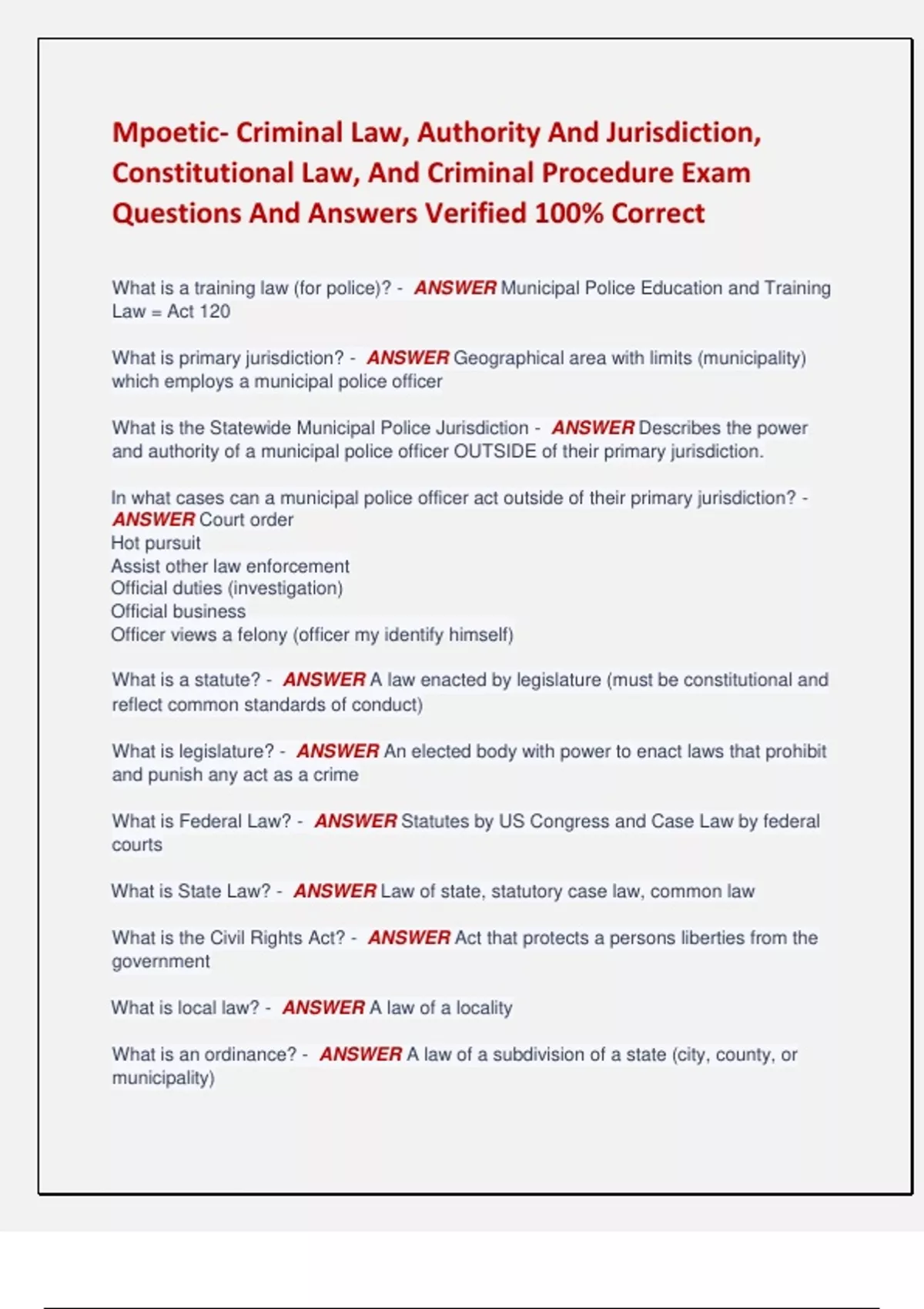 Mpoetic- Criminal Law, Authority And Jurisdiction, Constitutional Law, And Criminal Procedure Exam Questions And Answers Verified 100% Correct