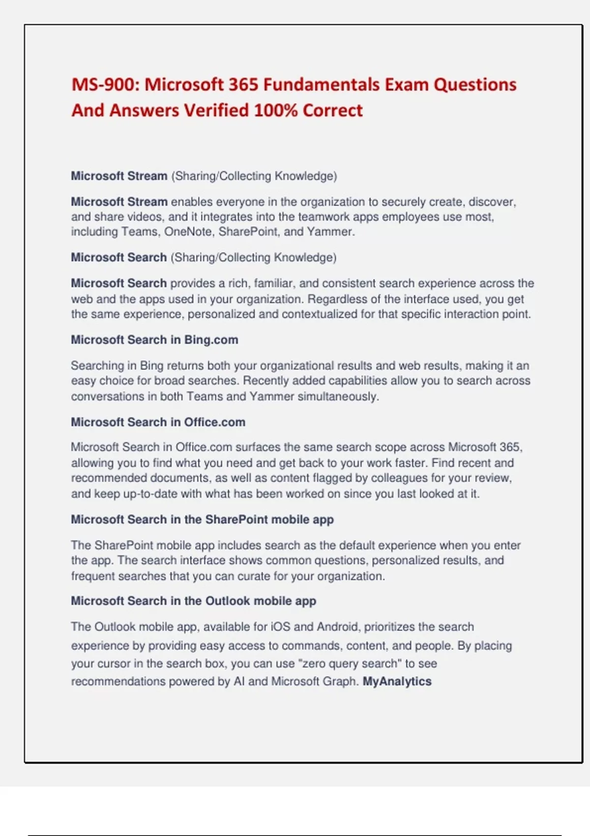 MS-900: Microsoft 365 Fundamentals Exam Questions And Answers Verified 100% Correct Microsoft Stream (Sharing/Collecting Knowledge) Microsoft Stream enables everyone in the organization to securely create, discover, and share videos, and it integrates into the teamwork apps employees use most, including Teams, OneNote, SharePoint, and Yammer. Microsoft Search (Sharing/Collecting Knowledge) Microsoft Search provides a rich, familiar, and consistent search experience across the web and the apps used in your organization. Regardless of the interface used, you get the same experience, personalized and contextualized for that specific interaction point. Microsoft Search in B Searching in Bing returns both your organizational results and web results, making it an easy choice for broad searches. Recently added capabilities allow you to search across conversations in both Teams and Yammer simultaneously. Microsoft Search in O Microsoft Search in O surfaces the same search scope across Microsoft 365, allowing you to find what you need and get back to your work faster. Find recent and recommended documents, as well as content flagged by colleagues for your review, and keep up-to-date with what has been worked on since you last looked at it. Microsoft Search in the SharePoint mobile app The SharePoint mobile app includes search as the default experience when you enter the app. The search interface shows common questions, personalized results, and frequent searches that you can curate for your organization. Microsoft Search in the Outlook mobile app The Outlook mobile app, available for iOS and Android, prioritizes the search experience by providing easy access to commands, content, and people. By placing your cursor in the search box, you can use "zero query search" to see recommendations powered by AI and Microsoft Graph. MyAnalytics lets you see how you spend your time at work and then suggests ways to work smarter - from cutting unproductive meeting time to getting better work/life balance. MyAnalytics does this by looking at data about emails, meetings, and Teams calls and chats, as well as how you use Office 365. MyAnalytics is included in the Microsoft 365 E5 subscriptions. Workplace Analytics While MyAnalytics provides insight at the individual level, Workplace Analytics focuses on the organization. Use Workplace Analytics to identify collaboration patterns that impact productivity, workforce effectiveness, and employee engagement. It helps you understand how your organization spends its time and how groups work together. When you understand how your org works, you can look for efficiencies and best practices. Modern Desktop Modern desktop describes a Windows 10 device that runs Office 365 ProPlus apps and is managed by Microsoft Enterprise Mobility + Security. The modern desktop is always up-to-date and uses insights and security powered by the cloud. Shifting to a modern desktop improves productivity and security for users and streamlines work for IT professionals. Right now, the top reason organizations are switching to the modern desktop is to address security concerns. Modern Desktop and feature updates For both Windows 10 and Office 365 ProPlus, feature updates are released more frequently, which means your users will get security and productivity capabilities multiple times a year, instead of once every three years. Deploying the Modern Desktop To deploy, you can use cloud-based services, including Microsoft Intune, or existing software management solutions such as System Center Configuration Manager. Critical parts of a planning an enterprise deployment (1) assessing your environment and network, and (2) making sure your existing hardware and applications will work with the new software. Tools to assess your applications and hardware are compatible Windows Analytics Upgrade Readiness, The Readiness Toolkit for Office add-ins and VBA, Desktop App Assure. Windows Analytics Upgrade Readiness The recommended tool for assessing desktop device and application readiness. It provides application and driver compatibility information to give you a detailed assessment of issues that might block your upgrade. It's supported with links to suggested fixes known to Microsoft. The Readiness Toolkit for Office add-ins and VBA This tool can help you identify compatibility issues with your Microsoft VBA macros and add-ins that you use with Office. The toolkit can scan for VBA macros in Word, Excel, PowerPoint, Outlook, Access, Project, Visio, and Publisher files for Office versions as far back as Office 2003. It can also scan for certain types of add-ins used with Office. Desktop App Assure The FastTrack Center Benefit for Windows 10 provides access to Desktop App Assure, a new service designed to address issues with Windows 10 and Office 365 ProPlus application compatibility. For customers with an eligible subscription, a Microsoft engineer works with you to address valid application issues. Peer-to-peer update download solutions Branch cache, peer cache, delivery optimization. BranchCache BranchCache can help you download source files in distributed environments without saturating the network. BranchCache fetches content from your main office or hosted cloud content servers and caches the content at branch office locations, allowing client computers at branch offices to access the content locally. Peer cache Peer cache is a solution in Configuration Manager that enables clients to share source files with other clients directly from their local cache. You can use peer cache to help manage deployment of source files to clients in remote locations. BranchCache and peer cache are complementary and can work together in the same environment. Delivery Optimization Delivery Optimization allows clients to download source files from alternate sources (such as other peers on the network) in addition to the traditional Internet-based Windows Update servers. You can use Delivery Optimization with Windows Update, 