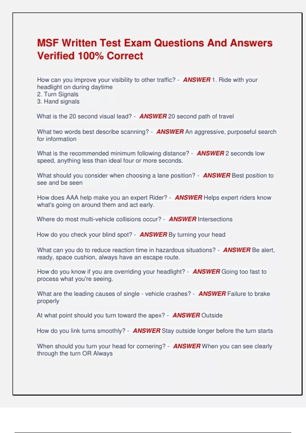 MSF Written Test Exam Questions And Answers Verified 100% Correct How can you improve your visibility to other traffic? - ANSWER 1. Ride with your headlight on during daytime 2. Turn Signals 3. Hand signals What is the 20 second visual lead? - ANSWER 20 second path of travel What two words best describe scanning? - ANSWER An aggressive, purposeful search for information What is the recommended minimum following distance? - ANSWER 2 seconds low speed, anything less than ideal four or more seconds. What should you consider when choosing a lane position? - ANSWER Best position to see and be seen How does AAA help make you an expert Rider? - ANSWER Helps expert riders know what's going on around them and act early. Where do most multi-vehicle collisions occur? - ANSWER Intersections How do you check your blind spot? - ANSWER By turning your head What can you do to reduce reaction time in hazardous situations? - ANSWER Be alert, ready, space cushion, always have an escape route. How do you know if you are overriding your headlight? - ANSWER Going too fast to process what you're seeing. What are the leading causes of single - vehicle crashes? - ANSWER Failure to brake properly At what point should you turn toward the apex? - ANSWER Outside How do you link turns smoothly? - ANSWER Stay outside longer before the turn starts When should you turn your head for cornering? - ANSWER When you can see clearly through the turn OR Always How is the front brake applied to stop quickly in a straight line? - ANSWER Smoothly and firmly with increasing pressure. How is the rear brake applied to stop quickly in a straight line? - ANSWER Light-to- lighter pressure to prevent skidding. What is the shortest way to stop in a curve? - ANSWER Straighten then brake When braking in a lean, what is important to remember? - ANSWER If road/traffic conditions do not allow you to straighten, use your brakes smoothly & gently. What is counter steering? - ANSWER Pressure on handgrip (countersteering) causes lean in direction of turn. What should you always avoid while swerving? - ANSWER Never attempt to brake while swerving Where should you look while swerving? - ANSWER Eyes on your escape path Where should you look when crossing obstacles? - ANSWER Grip handlesbars firmly and look ahead. What approach angle is recommended when crossing obstacles? - ANSWER A 90 degree angle What indicates a potential change in roadway traction? - ANSWER Changes in color and texture are clues that traction may change. How should you ride across low-traction surfaces? - ANSWER Reduce speed What should you do if you come upon a deer alongside the roadway? - ANSWER Use AAA aggressively (Awareness, Assessment, Action) What should you do if you suspect your sidestand will sink into the parking surface? - ANSWER Place a rigid object like a flattened soda can under it. What are three indicators of impairment? - ANSWER 1. Willingness to take risks 2. Failure to recognize behavior 3. Assume they ride better after a few drinks What are three examples of impairment? - ANSWER 1. Impaired Judgment 2. Divided attention 3. Impaired vision What percentage of rider fatalities are alcohol-related? - ANSWER 35% How does riding Under the Influence affect the AAA process - ANSWER Clear vision is impaired, Judgment and the ability to react properly and precisely is affected. What are some ways of intervening to prevent a friend from driving under the influence? - ANSWER 1. Arrange a safe ride home 2. Secure the motorcycle 3. Get others to help 4. Stop serving 5. Use an excuse 6. Hide the keys Give three reasons why motorcycling is more risky than driving a car. - ANSWER Vulnerability, Visibility, Judgment. What are some ways to prepare for the riding risks? - ANSWER Risk acceptance, Mental readiness, physical readiness, riding gear, understand your abilities/limitations, know your motorcycle and awareness of riding conditions. What does it mean to act responsibly? - ANSWER Demonstrate acceptance of and commitment to managing the risks of riding, helping reduce your chances of a crash, injury or death. What is the benefit of wearing apparel specifically designed for motorcycling - ANSWER Protection, comfort/cover, control. How does riding gear make a rider more comfortable? - ANSWER By protecting you from all elements. What is the difference between retro-reflective and reflective? - ANSWER Retro- reflective material: reflects light back to the source and illuminates the rider. Reflective, bright to make yourself more visible/visibility. Why aren't ordinary glasses or sunglasses sufficient eye protection? - ANSWER Do not provide adequate eye protection. What three things should you consider when shopping for riding gear? - ANSWER 1. Brightly colored/retro-reflective material. 2. Protection. 3. All kinds of riding conditions.